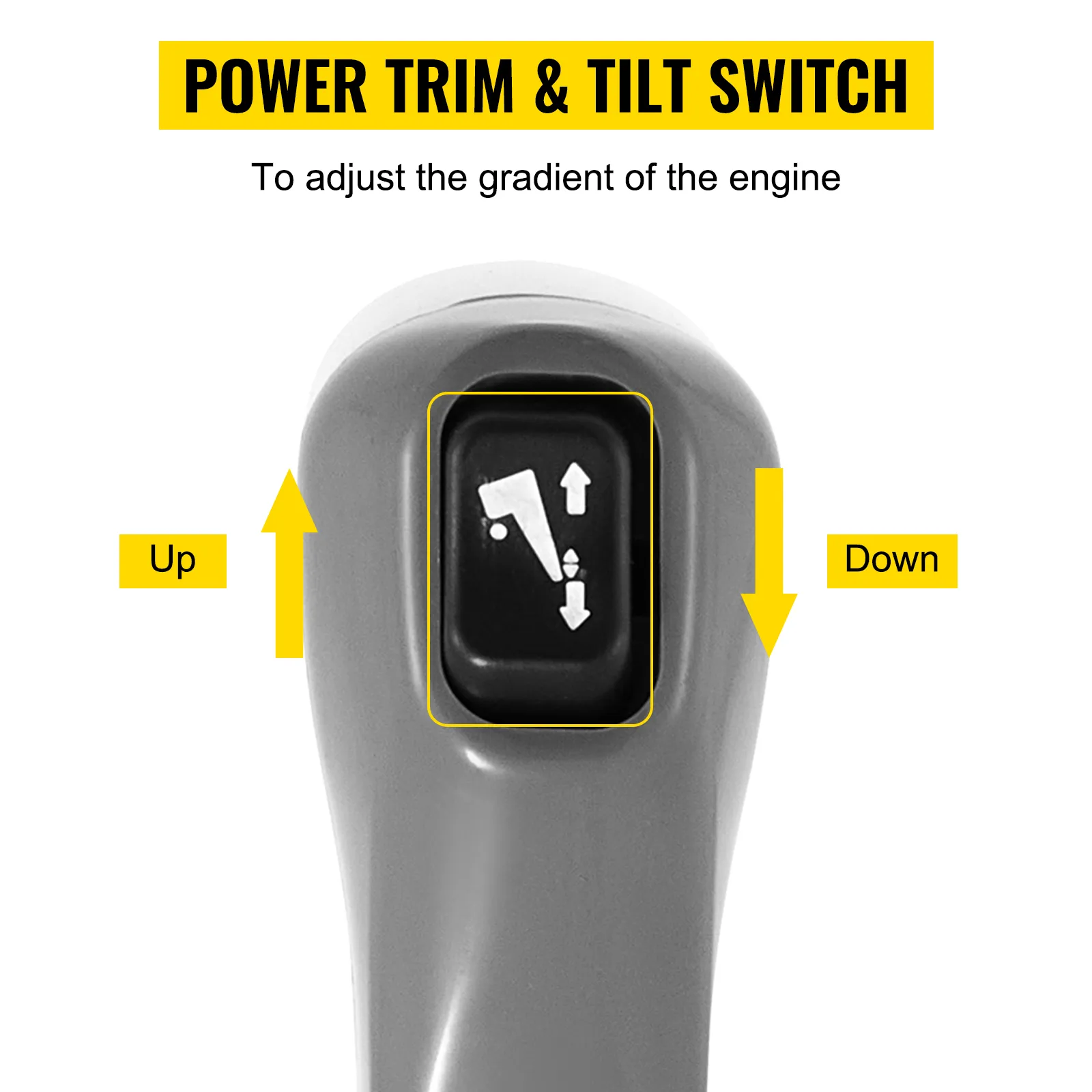 Diseños ergonómicos: el sistema de inclinación y trimado eléctrico puede ajustar el ángulo del motor fuera de borda. Presione el interruptor "hacia arriba", el motor fuera de borda se inclina y sube; Presione el interruptor "abajo" y el motor fuera de borda se inclina y baja. Y coloque la palanca de control en punto muerto, presione el botón del acelerador libre y gire la palanca de control. El acelerador se puede abrir sin cambiar a ninguna marcha.