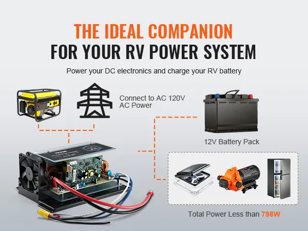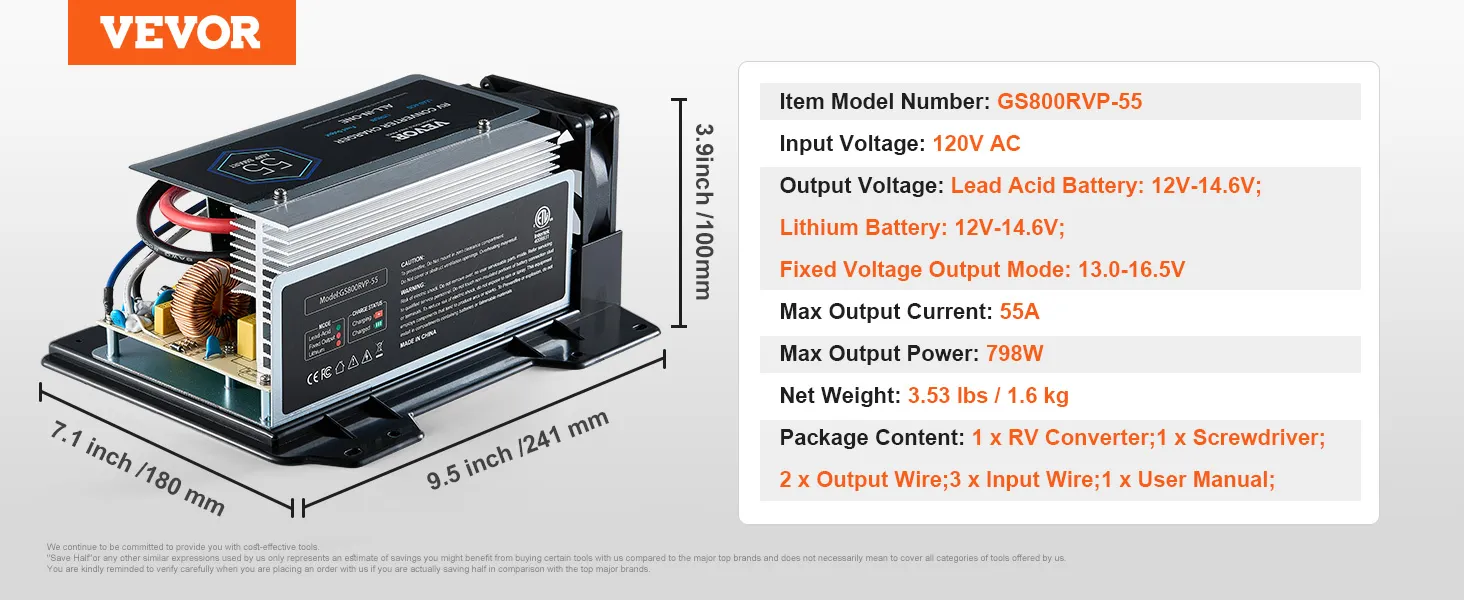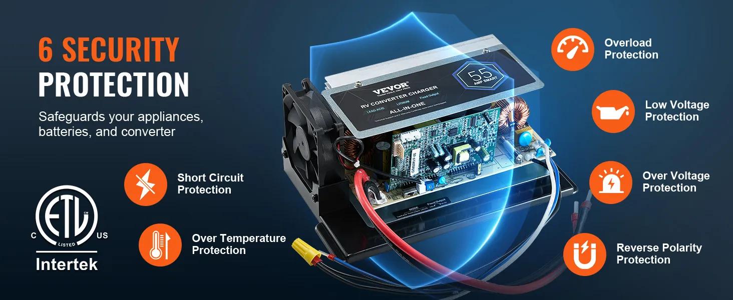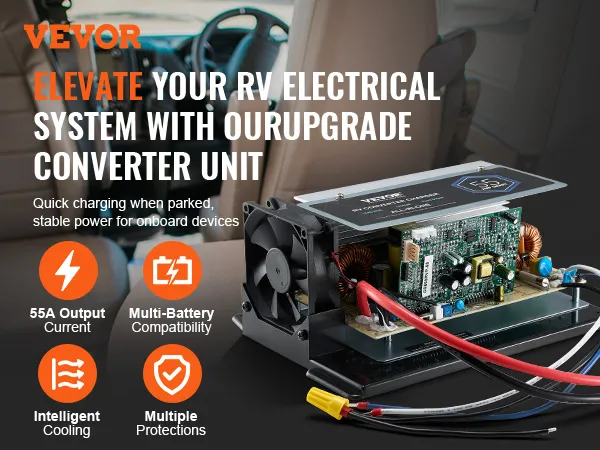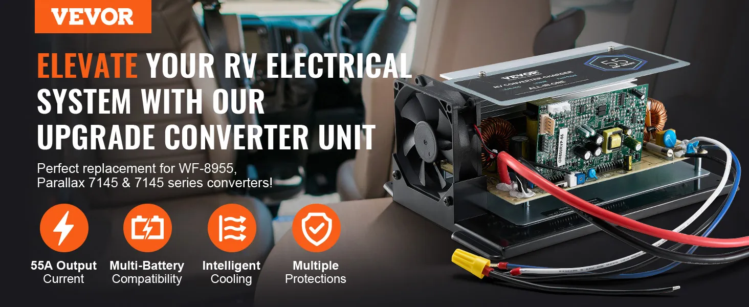 High-Performance 55A Converter: Delivering up to 55A of clean current, our RV power converter charge effortlessly drives all your RV electronics and appliances, from sound systems to lighting, ensuring comfort on every journey. Ideal for medium-capacity RV batteries ranging from 55Ah to 70Ah.