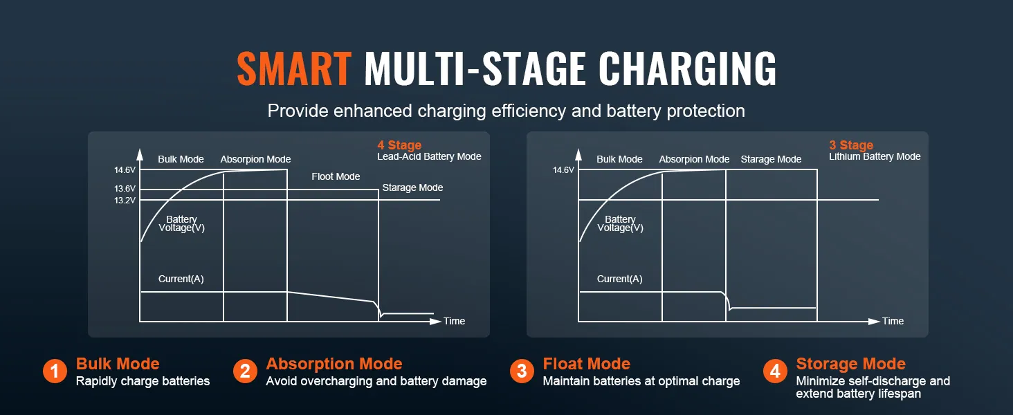 Dedicated Charging Modes: Our RV charge converter features specialized charging modes for different battery types, including lead-acid battery mode and LiFePO4 battery mode. These modes optimize charging curves and parameters for maximum efficiency. Plus, enjoy the flexibility of a fixed voltage mode, adjustable within a wide range from 13.0V to 16.5V.