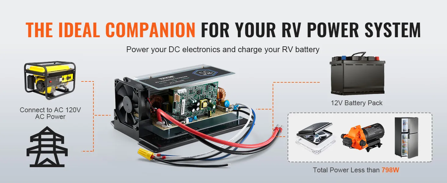 Gear up with our RV power converter—a must-have for your journey. It effortlessly converts AC to DC, powering all your 12V gadgets and appliances reliably. Keep everything running smoothly, from electronics to appliances, ensuring your adventure never misses a beat.