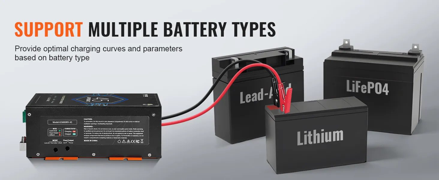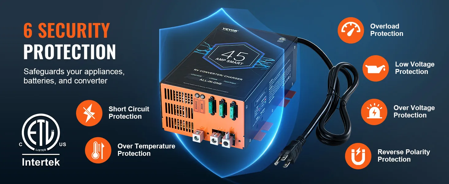Meet your RV’s power needs with confidence using our RV power converter charger. It supports both lithium and lead-acid batteries with dedicated charging modes and multi-stage smart charging technology. With 45A max output current and 6 security protections, it keeps batteries charged and ready.