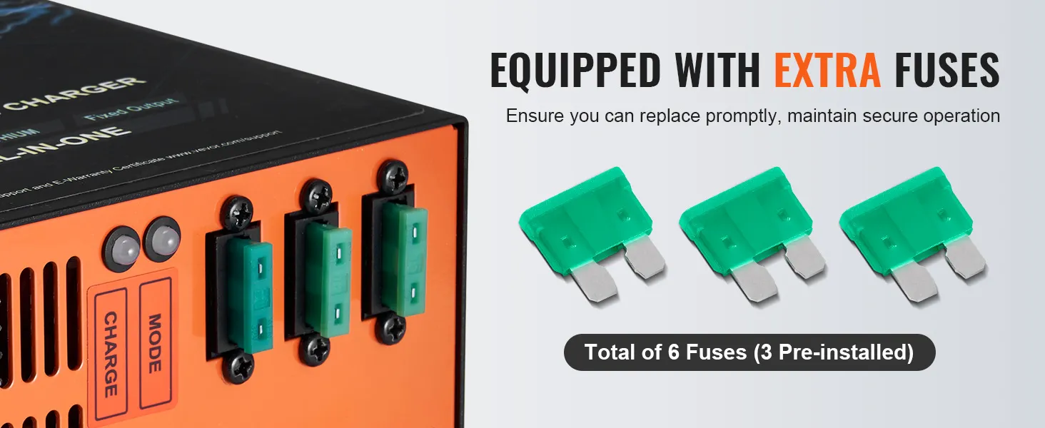 In case a fuse triggers and interrupts your circuit, our RV converter charger comes with spare fuses for quick and hassle-free replacement. Simply replace it to get your circuit back up and running without delay or the hassle of buying extra parts.