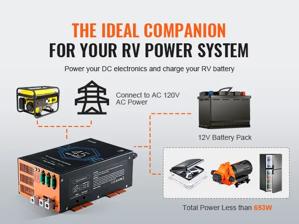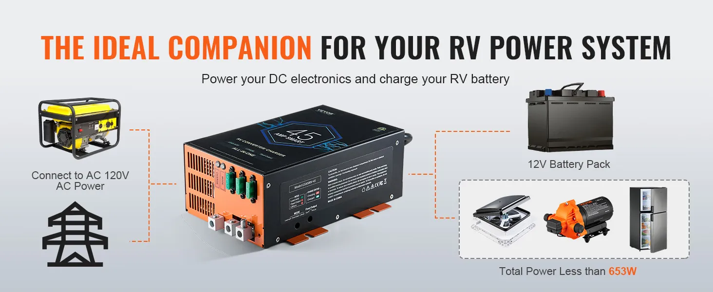 High-Performance 45A Converter: Delivering up to 45A of clean current, our RV power converter charge effortlessly drives all your RV electronics and appliances, from sound systems to lighting, ensuring comfort on every journey. Ideal for smaller capacity RV batteries ranging from 30Ah to 50Ah.