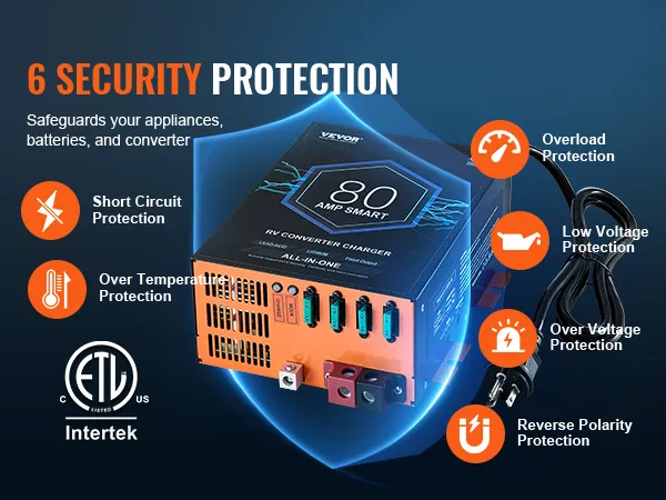 Advanced Protection Features: Tested to ETL Standard! We prioritize your security and equipment reliability. That's why our RV power converter boasts multiple protections: short circuit, over-temperature, overload, low voltage, over voltage, and reverse polarity protection.