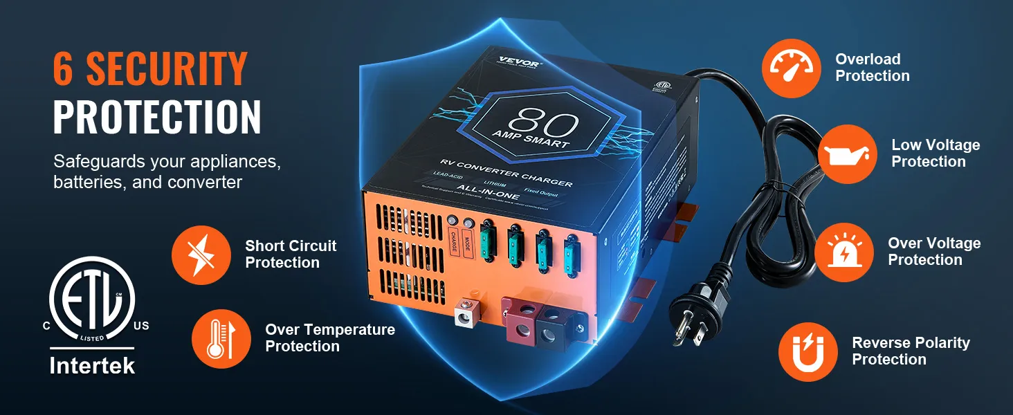 Meet all your camping and RV electrical needs with confidence! Our RV power converter supports lithium and lead-acid batteries with dedicated charging modes and multi-stage smart charging technology. With 80A max output current and 6 security protections, it keeps batteries charged and ready.