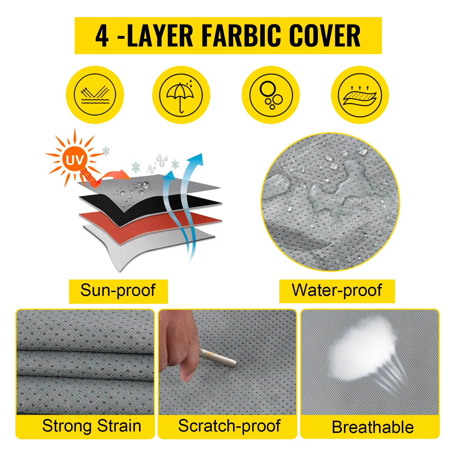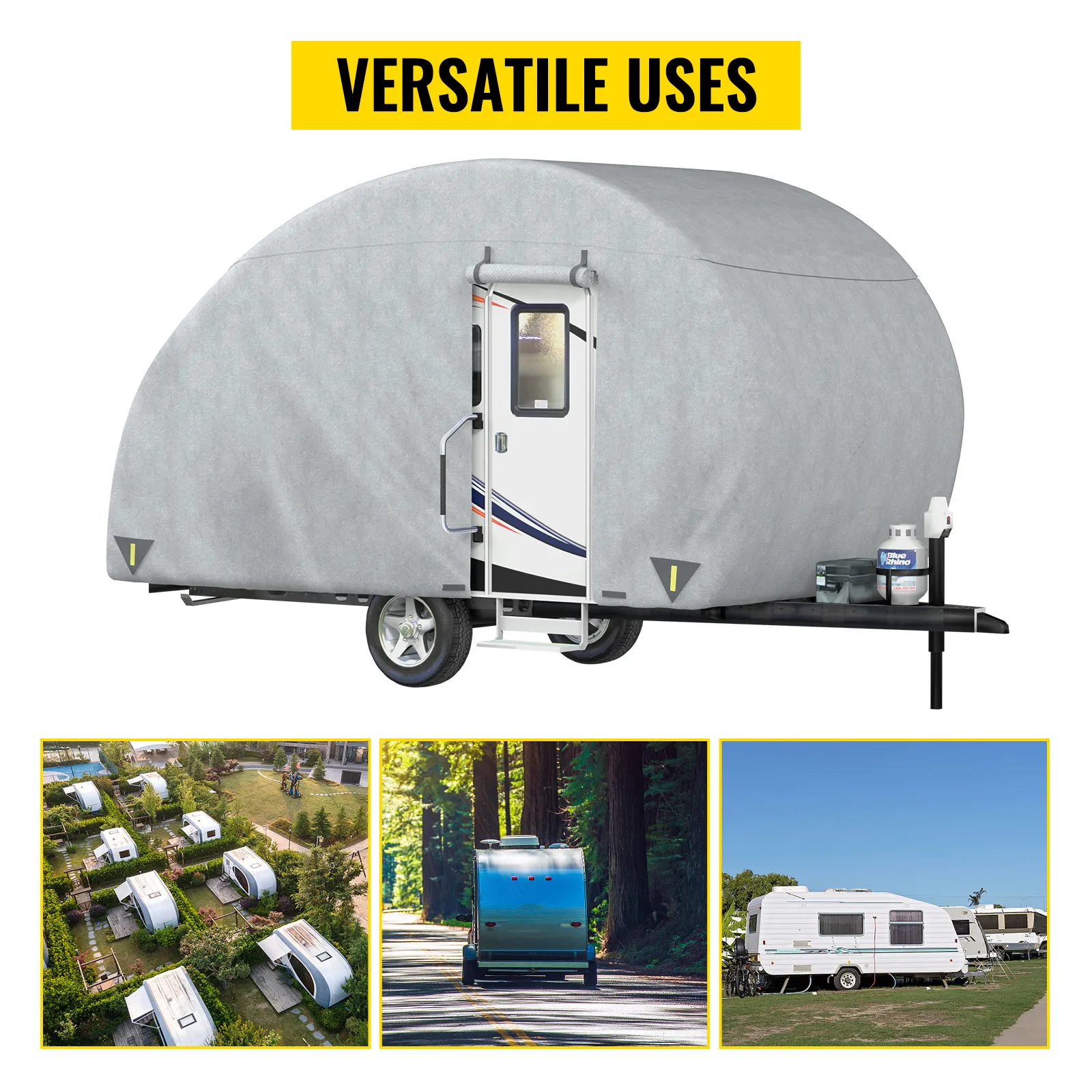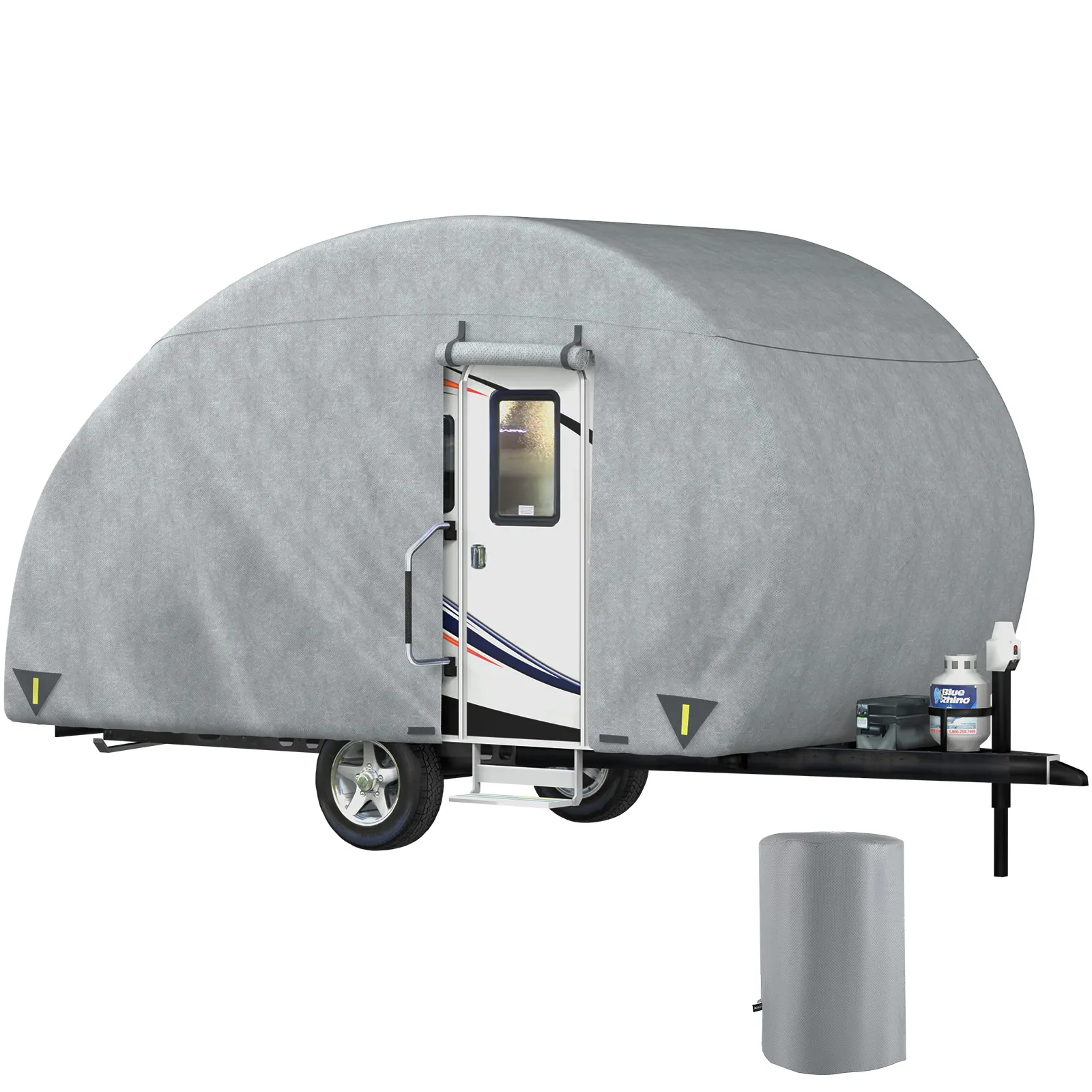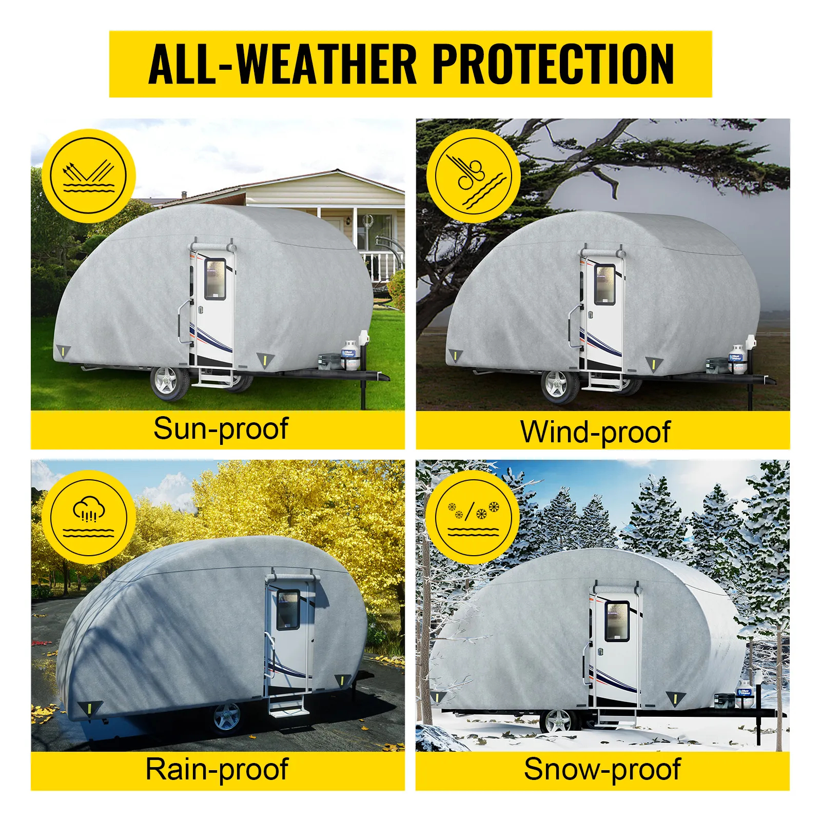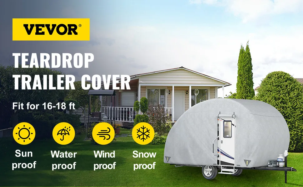 Esta funda impermeable para remolque con forma de lágrima tiene un tejido compuesto grueso de 4 capas con material de primera calidad para brindar protección contra todo tipo de clima durante todo el año. Nuestra funda para remolque cuenta con esquinas con dobladillo elástico de ajuste perfecto y costuras dobles, que pueden resistir bien incluso en climas lluviosos, nevados y ventosos. La funda perfecta para remolque hace que su vida al aire libre sea mucho más agradable y memorable.