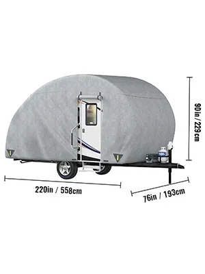 Nuestra cubierta para caravana en forma de lágrima mide 220 x 76 x 90 pulgadas y puede cubrir completamente su remolque y brindar una conservación integral, sin importar el clima lluvioso, nevado o nublado, su remolque no se dañará por un clima tan severo.