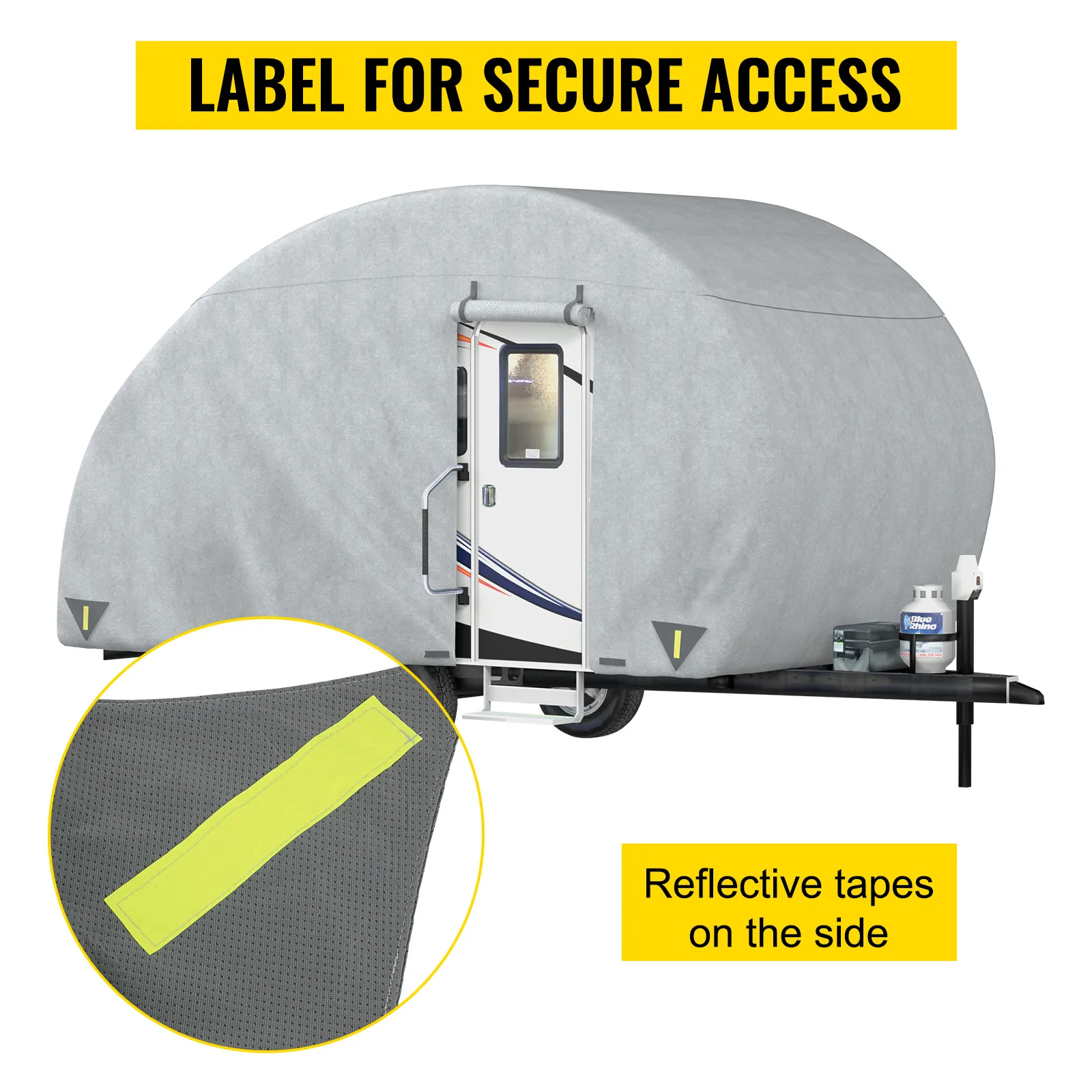 La funda para caravana con solapa tiene dobladillos elásticos en las esquinas para un ajuste rápido y regulable. Además, las etiquetas reflectantes, los cierres de velcro y las costuras cosidas para mayor comodidad y otros detalles están bien diseñados para un uso prolongado.