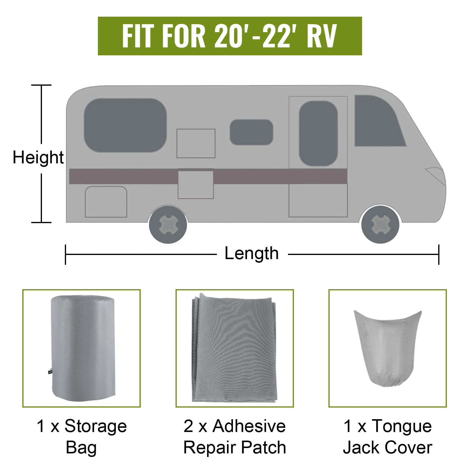 Nuestra cubierta para caravana se adapta a vehículos recreativos de hasta 20-22 pies de largo. Esta cubierta de remolque de viaje de alta calidad para vehículos recreativos puede brindar varias comodidades y protección integral a su vehículo recreativo.