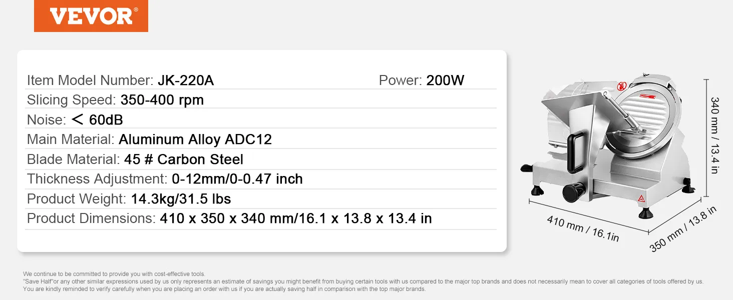 Cortadora de carne comercial VEVOR, cortadora eléctrica de 200 W para fiambres, 350-400 RPM, con cuchilla de acero al carbono de 8 pulgadas, grosor ajustable de 0 a 0,47 pulgadas, para uso doméstico y comercial.