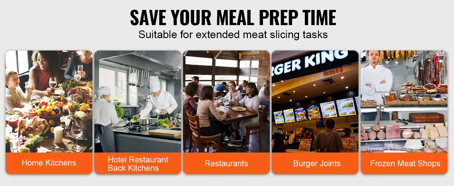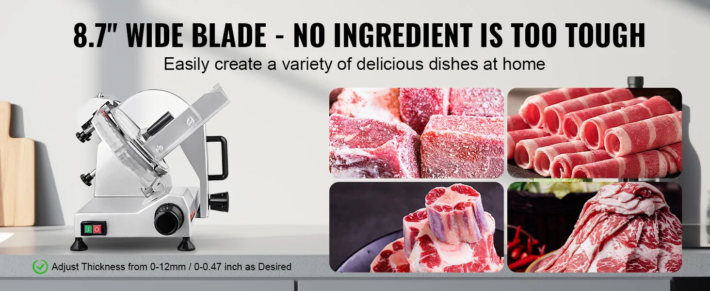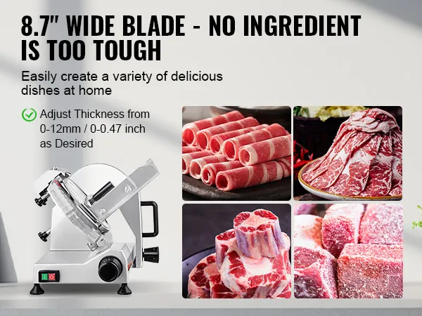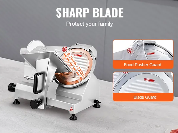 Hoja de 8": nuestra cortadora de carne está equipada con una hoja mejorada de acero al carbono 45 # de 8" de ancho. Mantenga la hoja afilada con la piedra de afilar incorporada, manipulando sin esfuerzo una variedad de texturas de alimentos, como carne congelada, queso, carne cruda, carne cocida, jamón y pan.