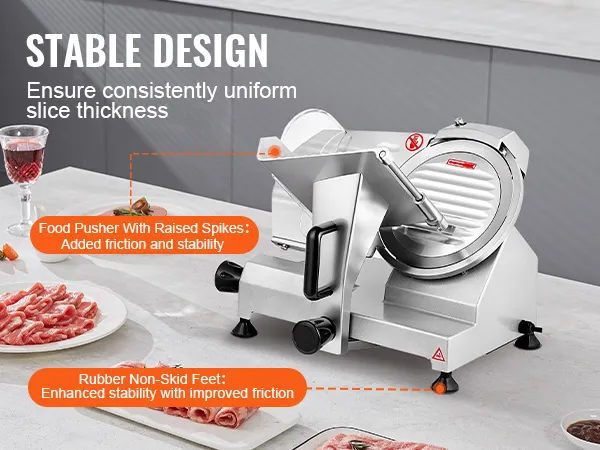Estabilidad y seguridad: Nuestro cortador de carne congelada incluye un empujador de alimentos elevado con púas sobresalientes y patas antideslizantes, lo que garantiza un corte de carne estable y suave. El empujador de alimentos protege eficazmente su seguridad mientras trabaja.