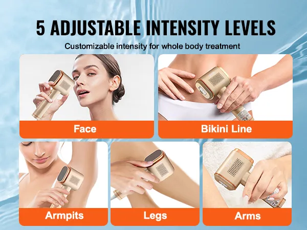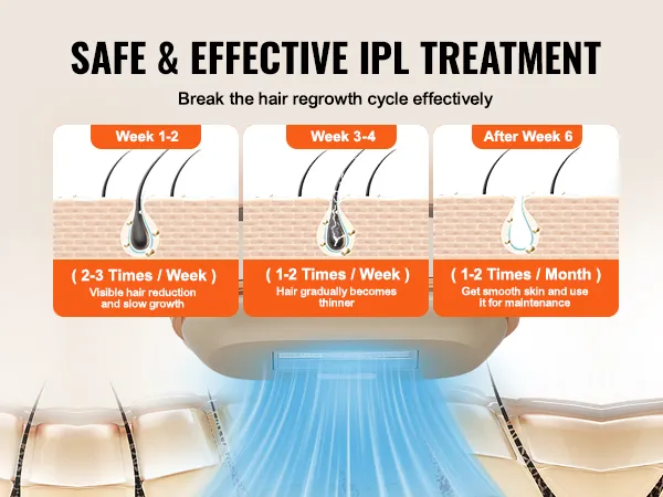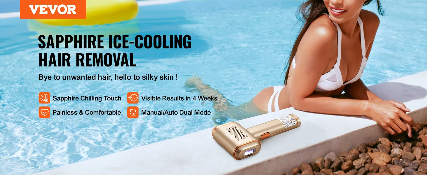 Toque de enfriamiento de hielo de zafiro mejorado: disfrute de una depilación indolora con la IPL avanzada VEVOR con sistema de enfriamiento de hielo de zafiro. Con un toque refrescante de 52 a 88 °F, brinda una relajante sensación helada a la piel, lo que garantiza una depilación fría y segura al mismo tiempo que promueve una piel sana y sedosa.
