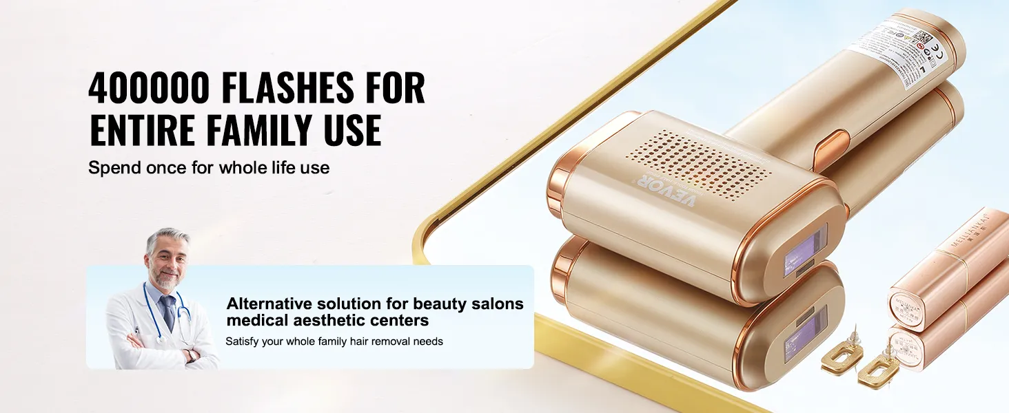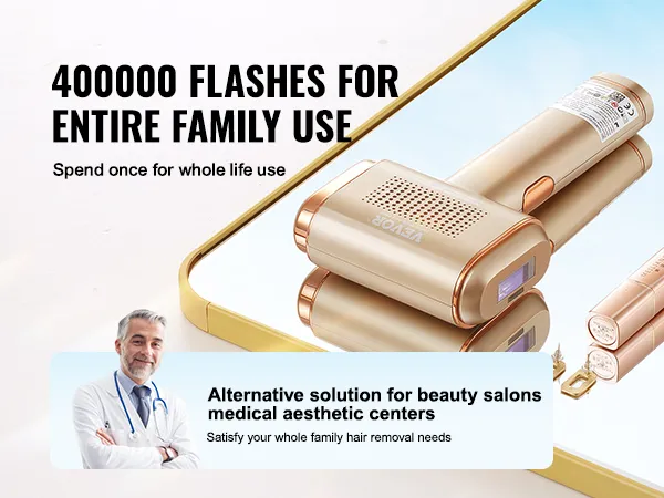 ¿Estás cansado de dispositivos que necesitan reemplazos constantes? Nuestro depilador IPL cuenta con 400.000 tiempos de flash, lo que lo convierte en la solución de depilación perfecta para uso a largo plazo. Es como tener un tratamiento de depilación de salón en casa, que satisface las necesidades de depilación de toda su familia.