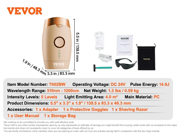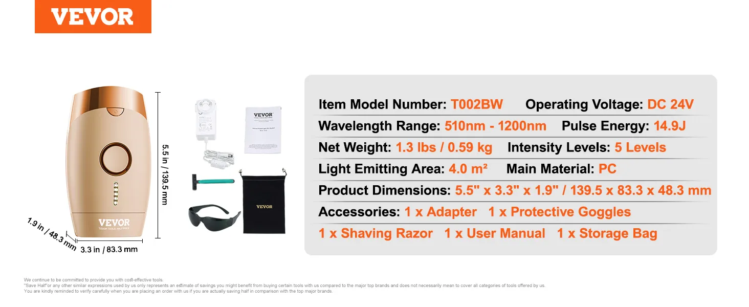 Efectivo para la mayoría de los tipos de cabello: ¿Buscas el regalo perfecto? ¡La depilación permanente VEVOR IPL ya está aquí! Es seguro y efectivo para la mayoría de los tipos de cabello, actualizado a 400,000 veces de flash, suficiente para satisfacer las necesidades de depilación de toda su familia. Menos costo mientras disfruta de un tratamiento profesional a nivel de salón en casa.