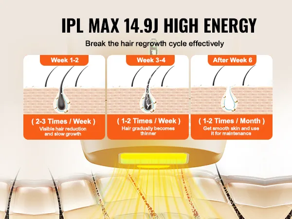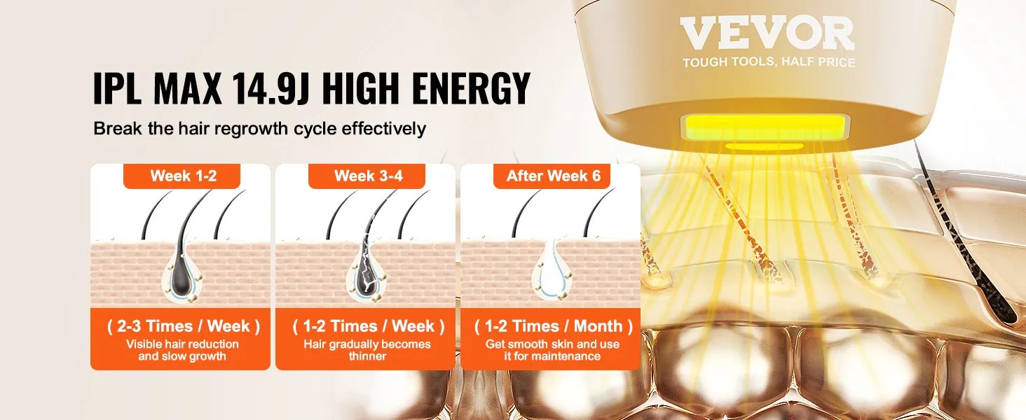 Efectiva, indolora y segura: disfrute de una depilación suave y eficiente con la tecnología IPL mejorada de VEVOR, manteniendo su piel sana y sedosa. Al penetrar profundamente en la piel hasta la raíz del cabello, elimina eficazmente la melanina, rompe el ciclo de crecimiento del cabello y protege los folículos.