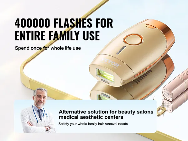 ¿Estás cansado de dispositivos que necesitan reemplazos constantes? Nuestro depilador IPL cuenta con 400.000 tiempos de flash, lo que lo convierte en la solución de depilación perfecta para uso a largo plazo. Es como tener un tratamiento de depilación de salón en casa, que satisface las necesidades de depilación de toda su familia.