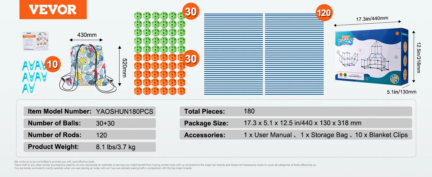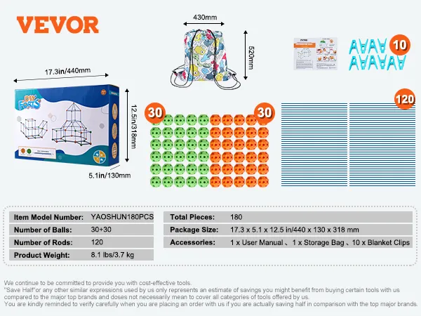 Disfrute de un gran valor con nuestro kit de construcción de fuertes VEVOR. Incluye piezas adicionales, construcción robusta (sin BPA) y viene con una práctica bolsa de almacenamiento y clips para manta.