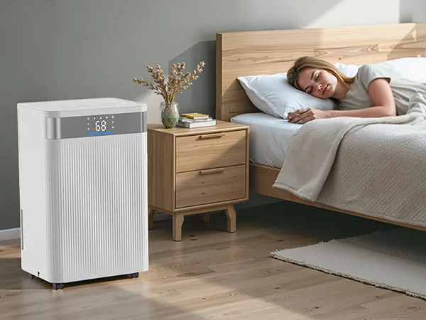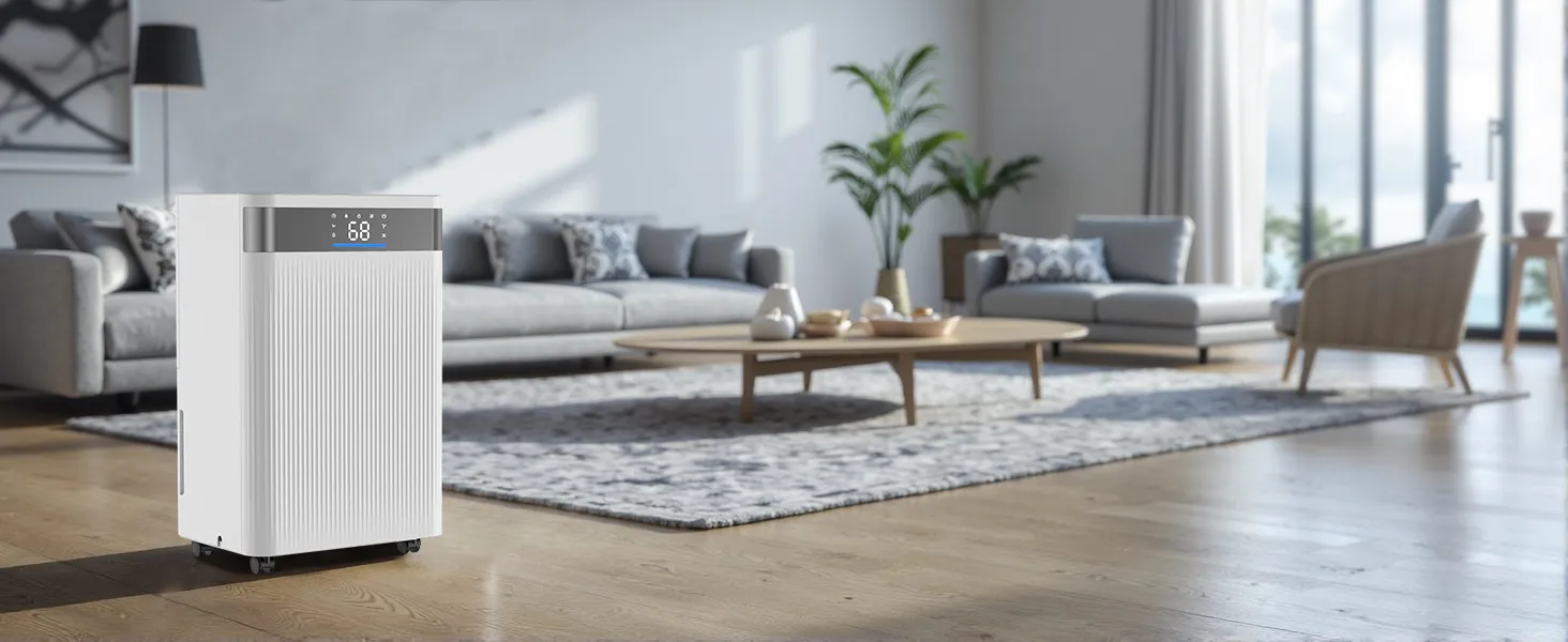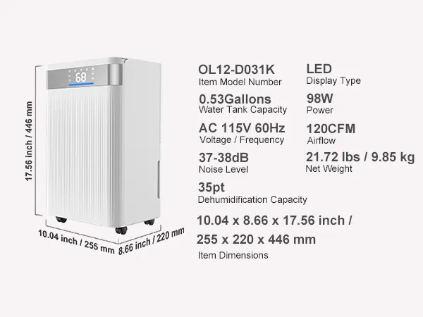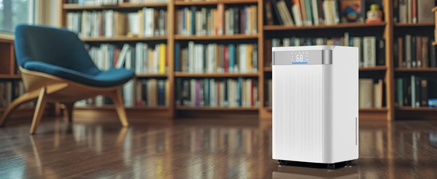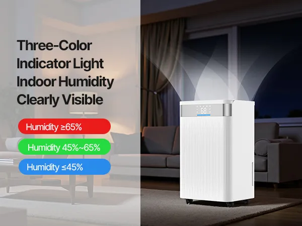 Potente deshumidificador doméstico que reduce rápidamente la humedad y cubre grandes espacios. Indicador de humedad inteligente de tres colores y bajo nivel de ruido para un funcionamiento silencioso. Ideal para salas de estar, dormitorios y trasteros.