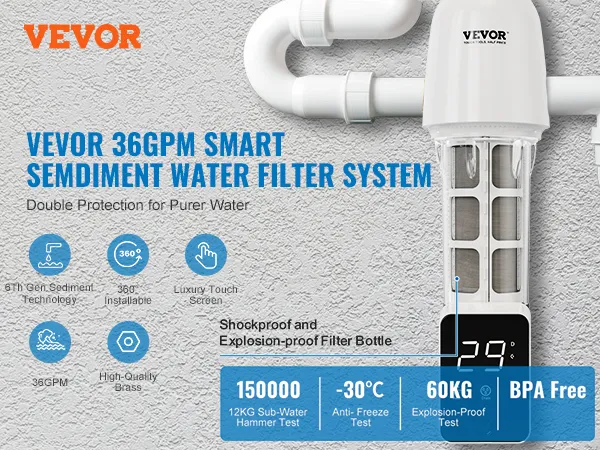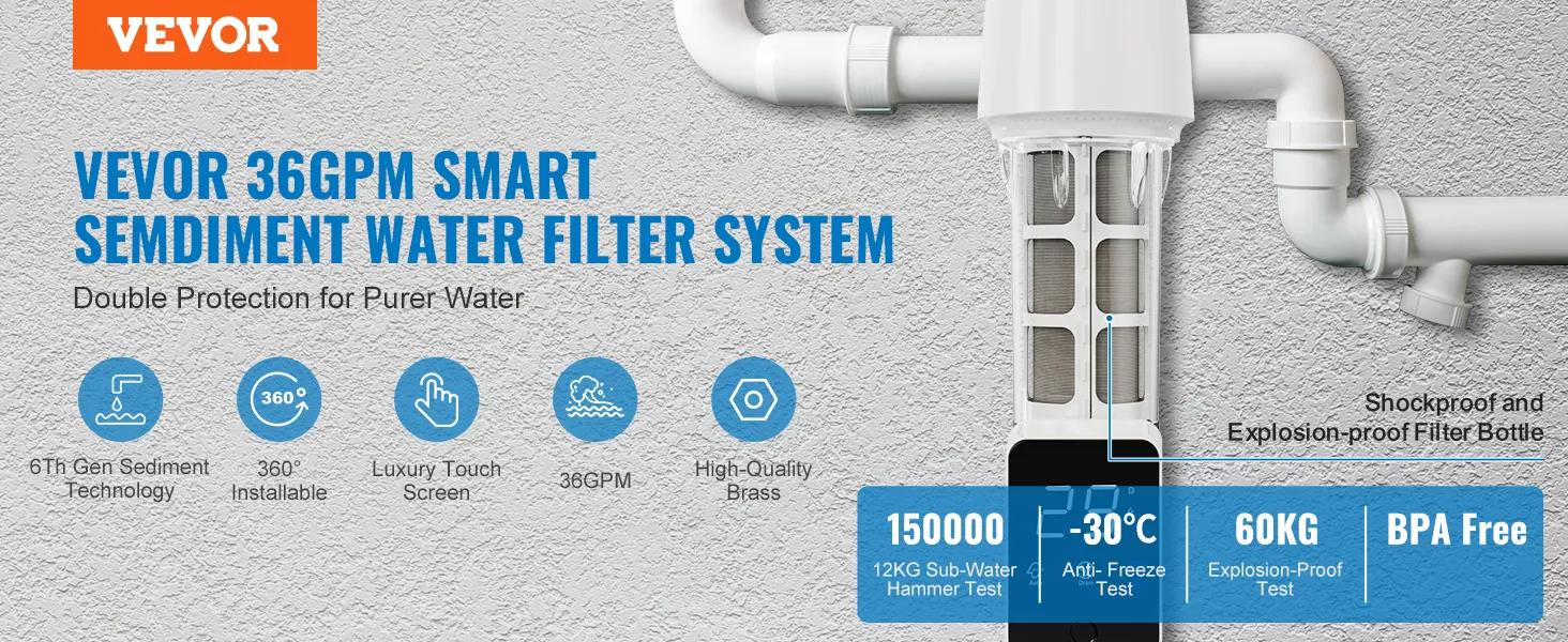 El prefiltro es la primera línea de defensa de los sistemas de agua domésticos, y VEVOR se compromete a mejorar la calidad del agua en la fuente, prolongando la vida útil de los electrodomésticos posteriores.
