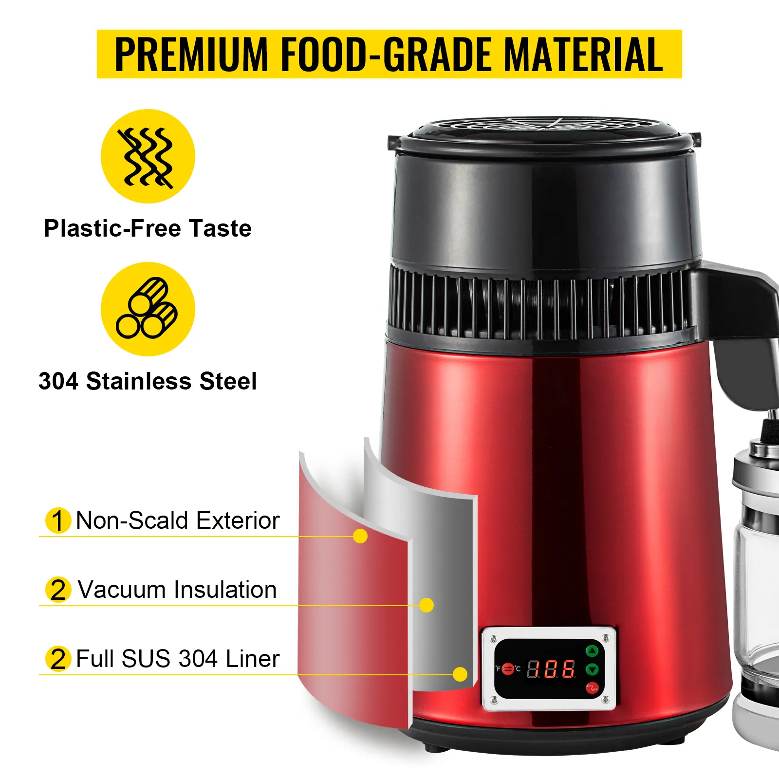 Destilando 4 litros en 4 horas, nuestro destilador eficiente es el resguardo de su salud, elimina contaminantes como bacterias, partículas, sólidos disueltos y COV para brindarle agua limpia y purificada. A excepción de la destilación de agua, nuestro producto también está diseñado para destilar alcohol, con una pantalla de visualización digital, la temperatura es ajustable. Puede disfrutar de whisky, brandy, vodka y otros licores destilados solo en su hogar.