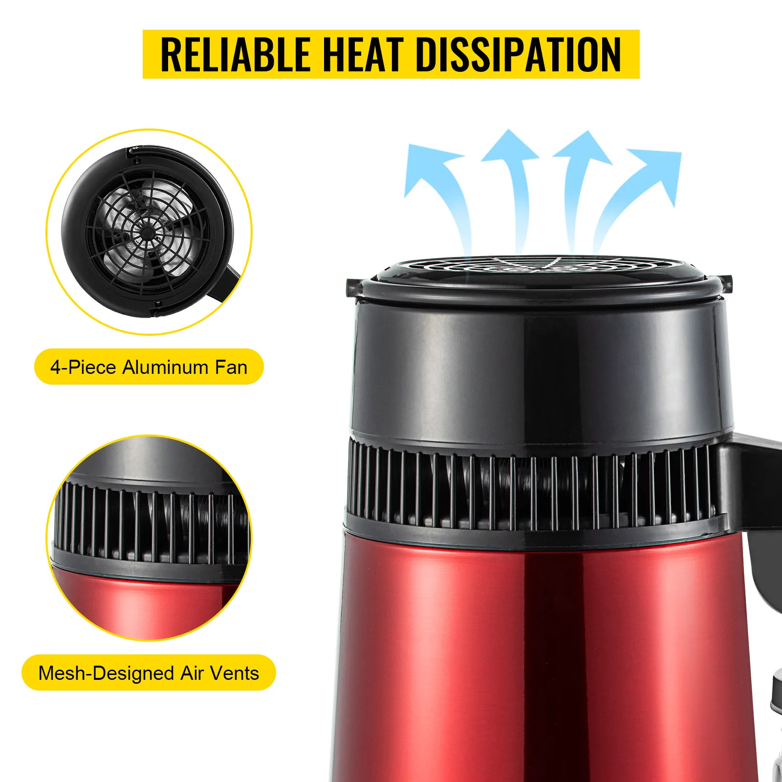 Todas las partes que entran en contacto con el líquido están hechas de acero inoxidable 304, incluyendo el tanque interno, la tapa interna, la bobina de condensación, la salida de agua y la entrada de agua. Cuenta con un recipiente de plástico sin BPA y un ventilador de refrigeración de aluminio.