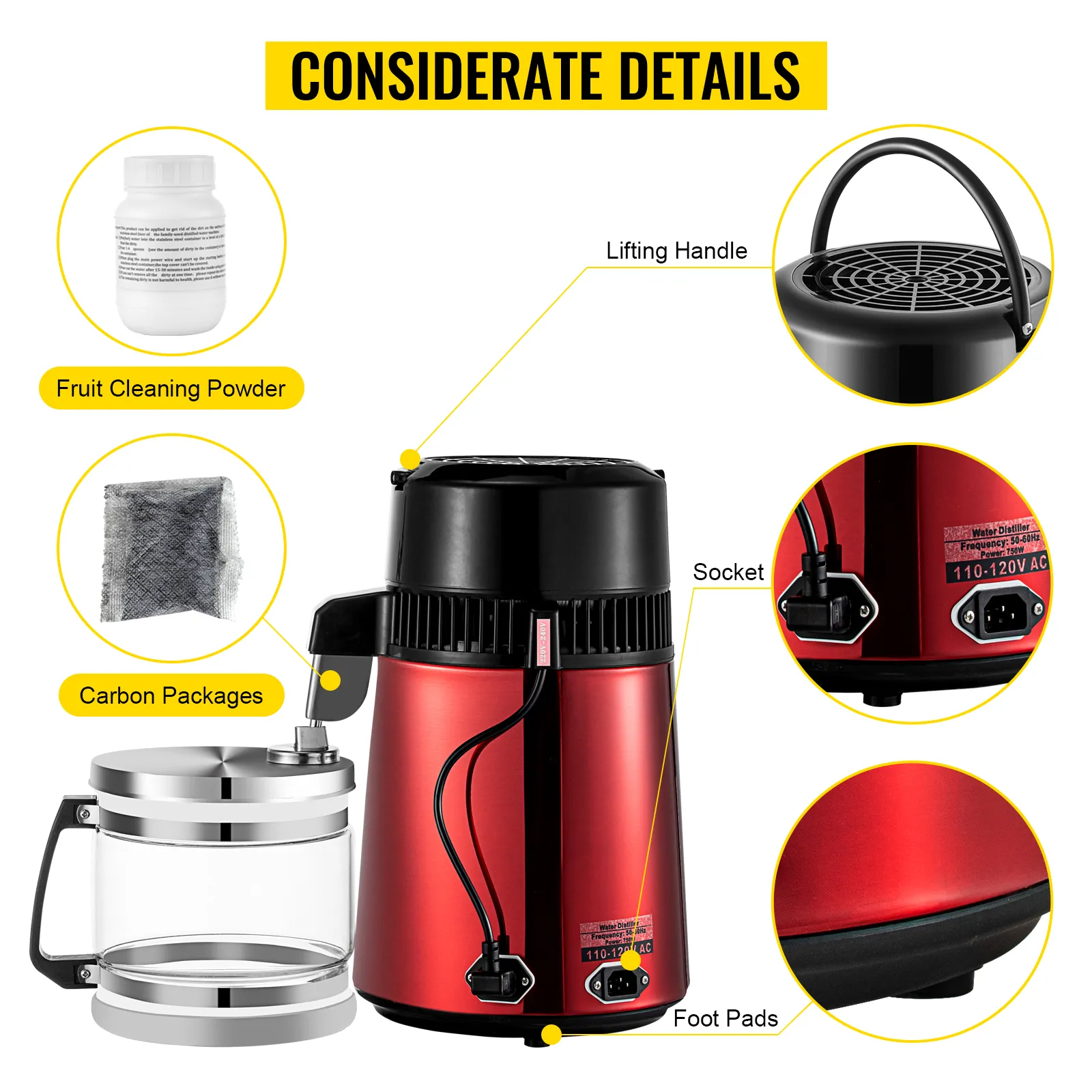 Con una alta eficiencia, se necesitan solo unas 4 horas para producir 4 l (1,06 gal EE. UU.) de agua destilada. El elemento calefactor de 50 Hz y 750 W hace que la velocidad de destilación sea superior a un cuarto de galón por hora, destila hasta 6 galones por día.
