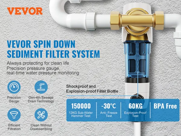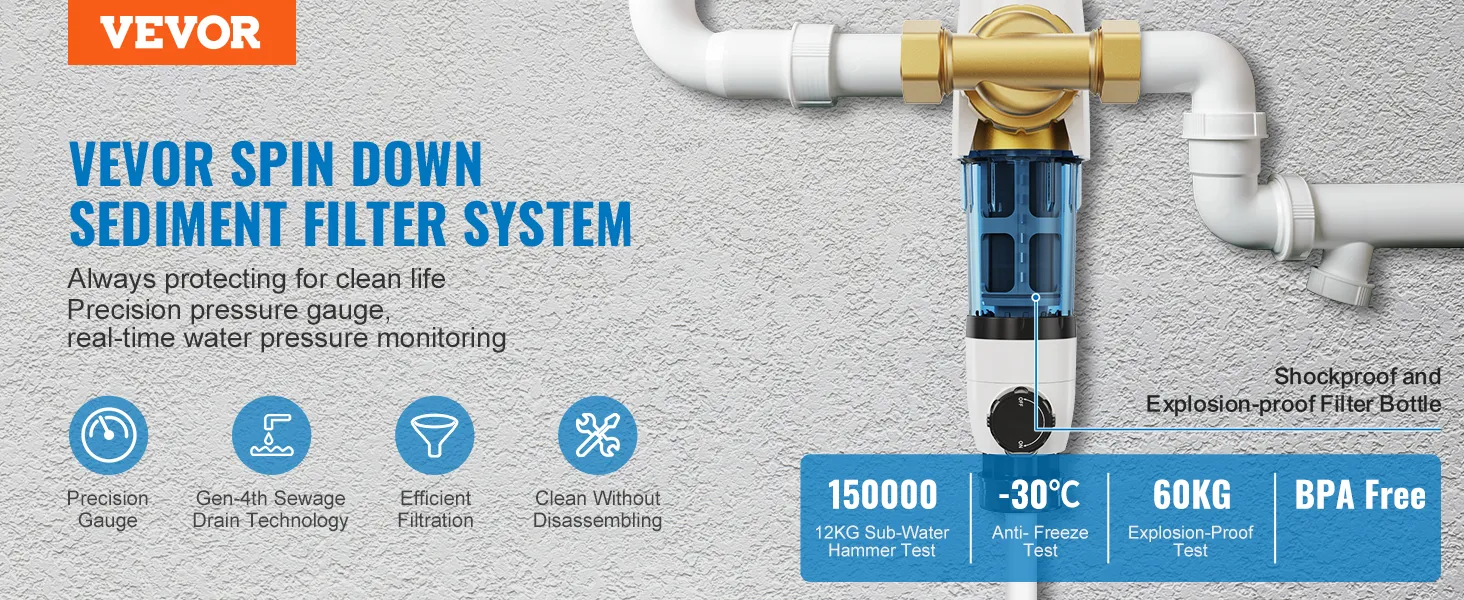 El prefiltro es la primera línea de defensa para los sistemas de agua domésticos, y VEVOR se compromete a mejorar la calidad del agua en la fuente, prolongando la vida útil de los electrodomésticos aguas abajo.