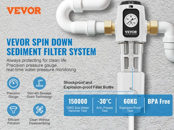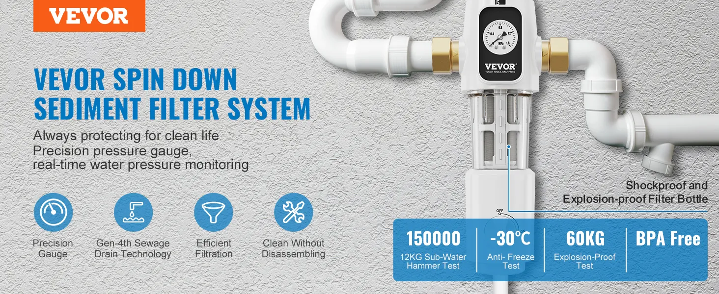 El prefiltro es la primera línea de defensa para los sistemas de agua domésticos, y VEVOR se compromete a mejorar la calidad del agua en la fuente, prolongando la vida útil de los electrodomésticos aguas abajo.