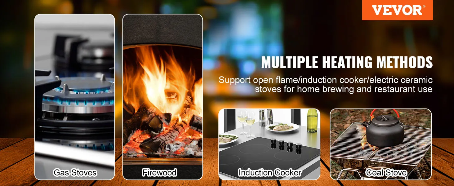 Uso multipropósito: puede hacer whisky, vino, vodka, agua destilada, etanol y aceite esencial, y también fermentar frutas y verduras y soja a través de nuestro destilador de alcohol de acero inoxidable. El fondo engrosado se puede calentar de varias maneras, incluyendo fuego abierto, cocina de inducción, estufas eléctricas, etc.