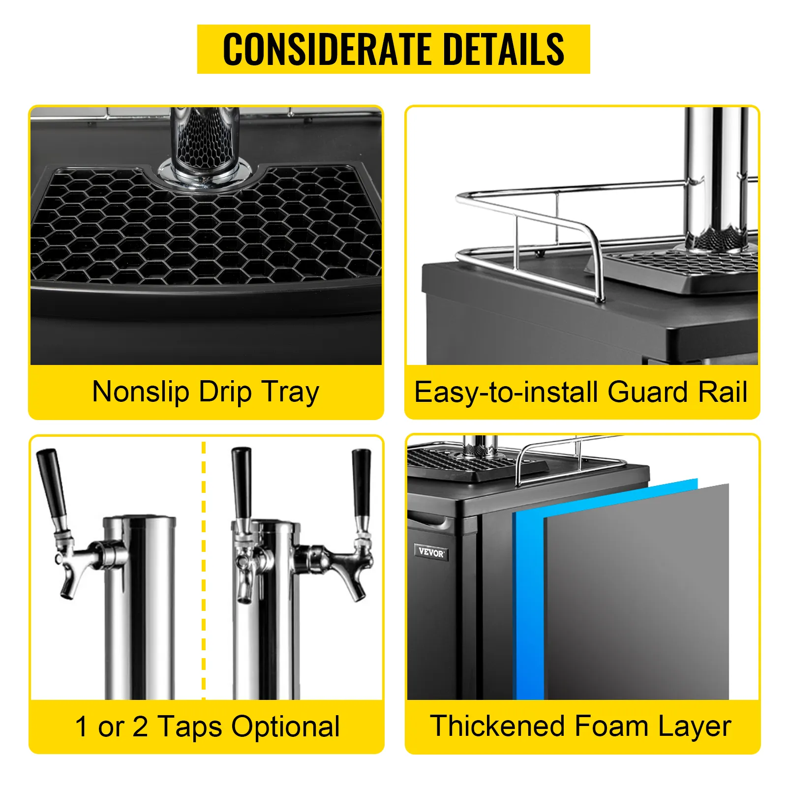 Nuestro refrigerador para cerveza cuenta con una bandeja de goteo antideslizante extraíble, un riel cromado fácil de instalar, una torre de cerveza reemplazable y una capa de espuma gruesa que ofrece una experiencia de bebida perfecta.