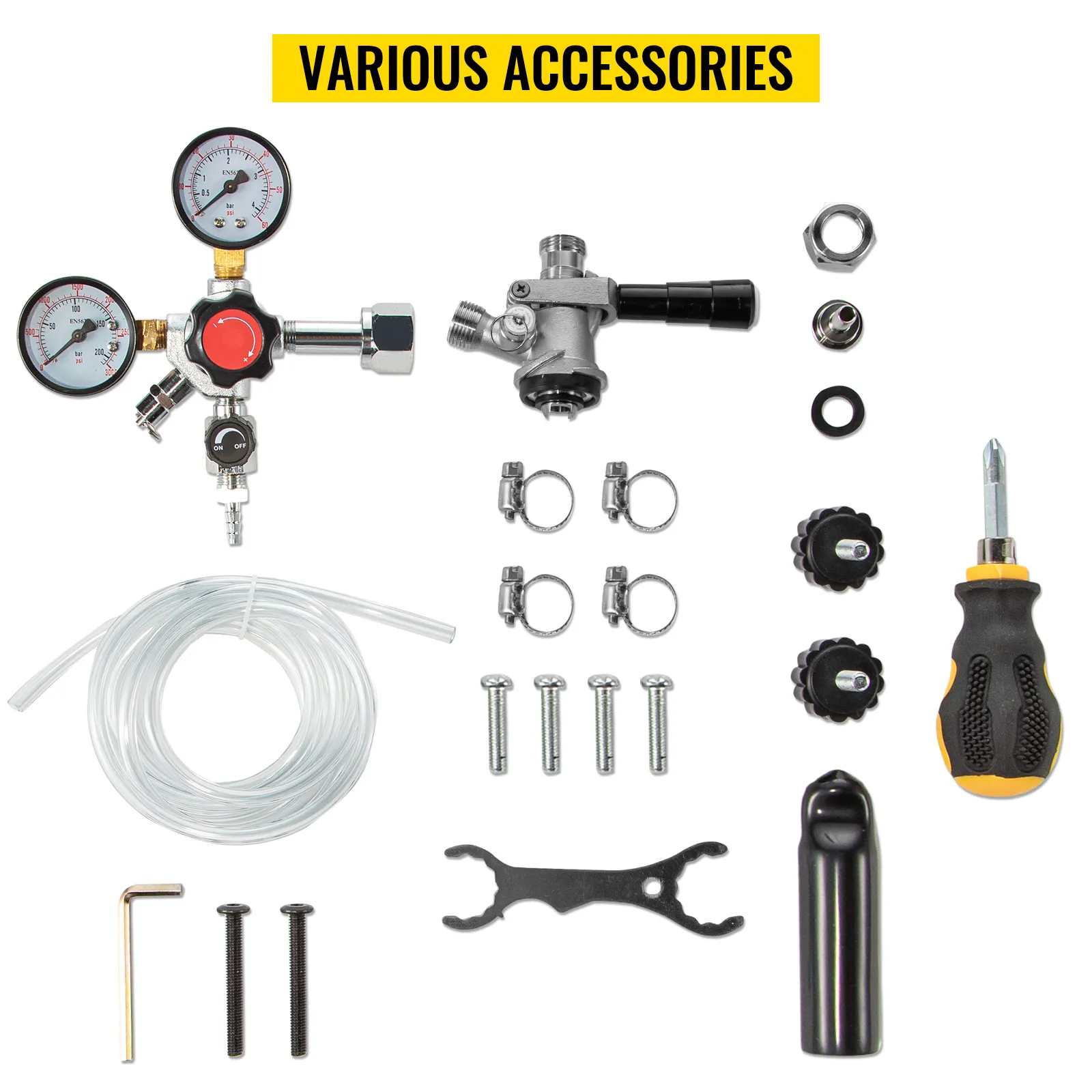 Se incluyen los accesorios completos. Son fáciles de instalar con el libro de instrucciones y las herramientas de instalación gratuitas. PD Por favor compre el tanque de CO2 usted mismo.