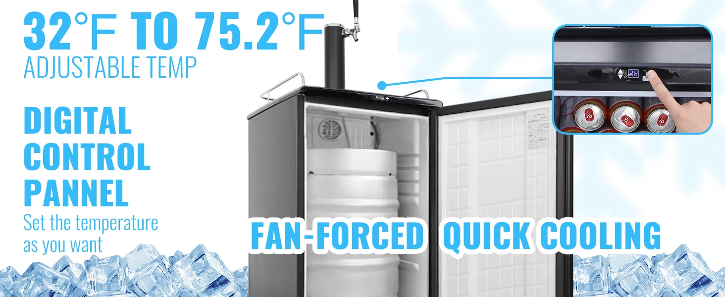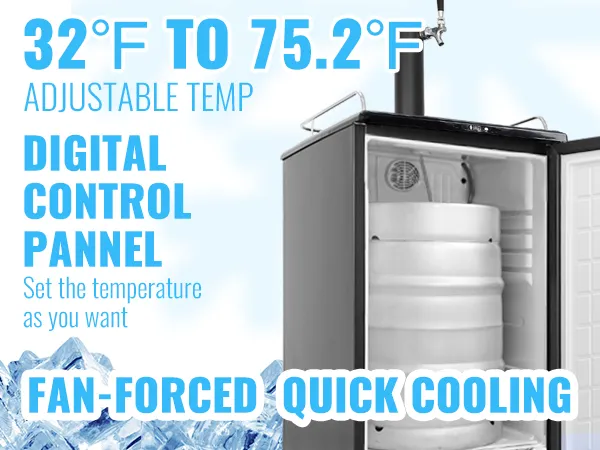 Establezca la temperatura adecuada: el refrigerador de barril tiene un panel de control de temperatura digital que le permite ajustar fácilmente la temperatura interna de 32 a 75,2 ℉. Esto le permite enfriar su cerveza a su temperatura preferida. Además, si hay un corte de energía, el refrigerador restaurará automáticamente la temperatura que configuró una vez que se restablezca la energía.