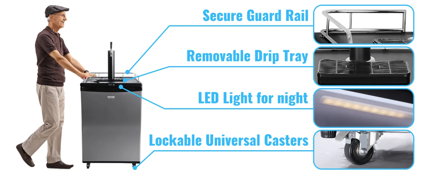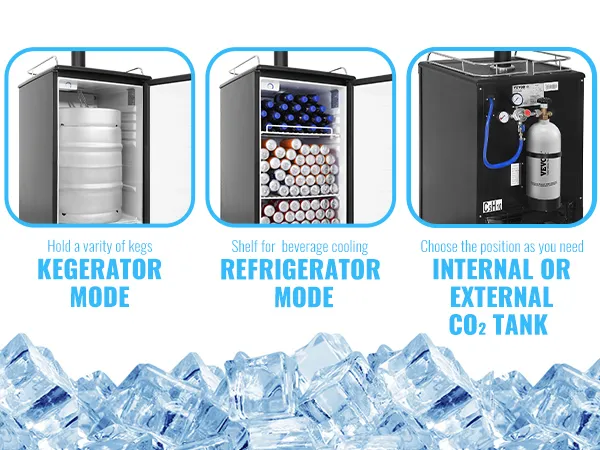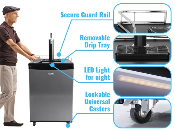 ¿Eres una persona cervecera? Si es así, ¡entonces te encantará esto! Nuestro Kegerator mantiene la cerveza fresca ya la temperatura ideal, mientras que la línea de cerveza de 9,8 pies garantiza una carbonatación perfecta. También funciona como un refrigerador para sus bebidas favoritas, lo que lo hace perfecto para uso en el hogar, bar o barbacoa.