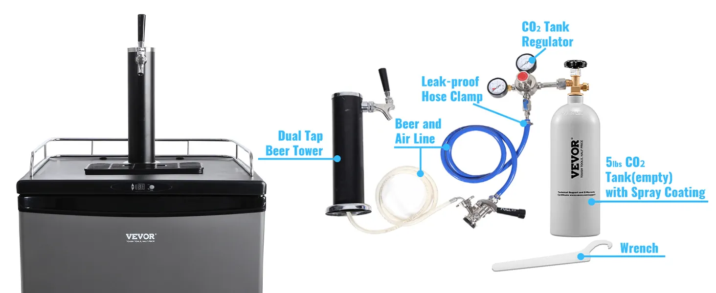 La instalación de este refrigerador de barril es muy sencilla con el manual de usuario incluido y las herramientas de instalación gratuitas. También recibirá un tanque de CO2 de 5 libras (vacío) con su barril de cerveza. Para mayor comodidad, proporcionamos abrazaderas de manguera y juntas para evitar fugas.