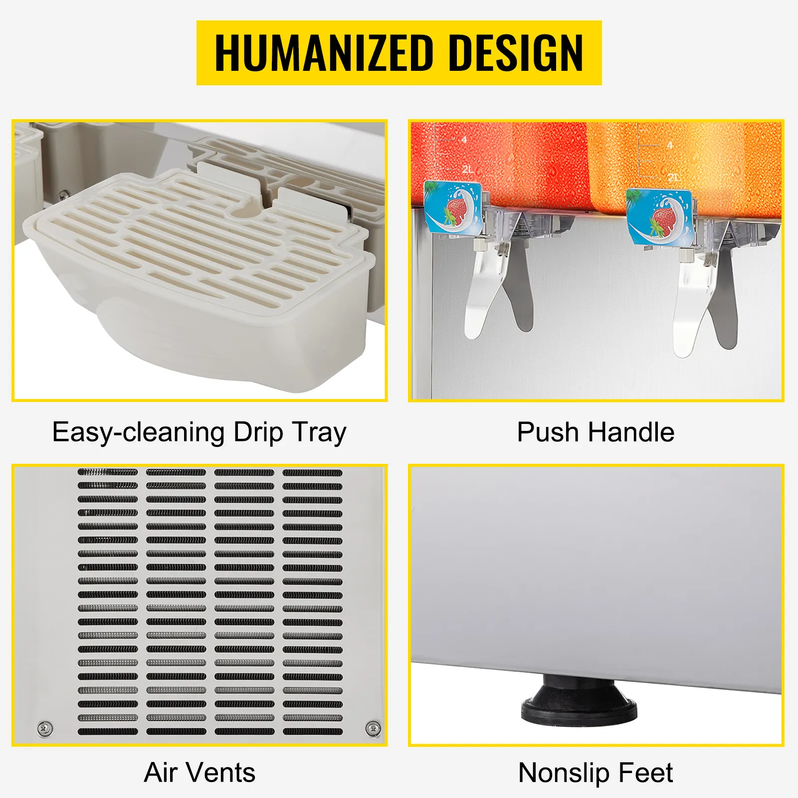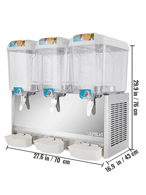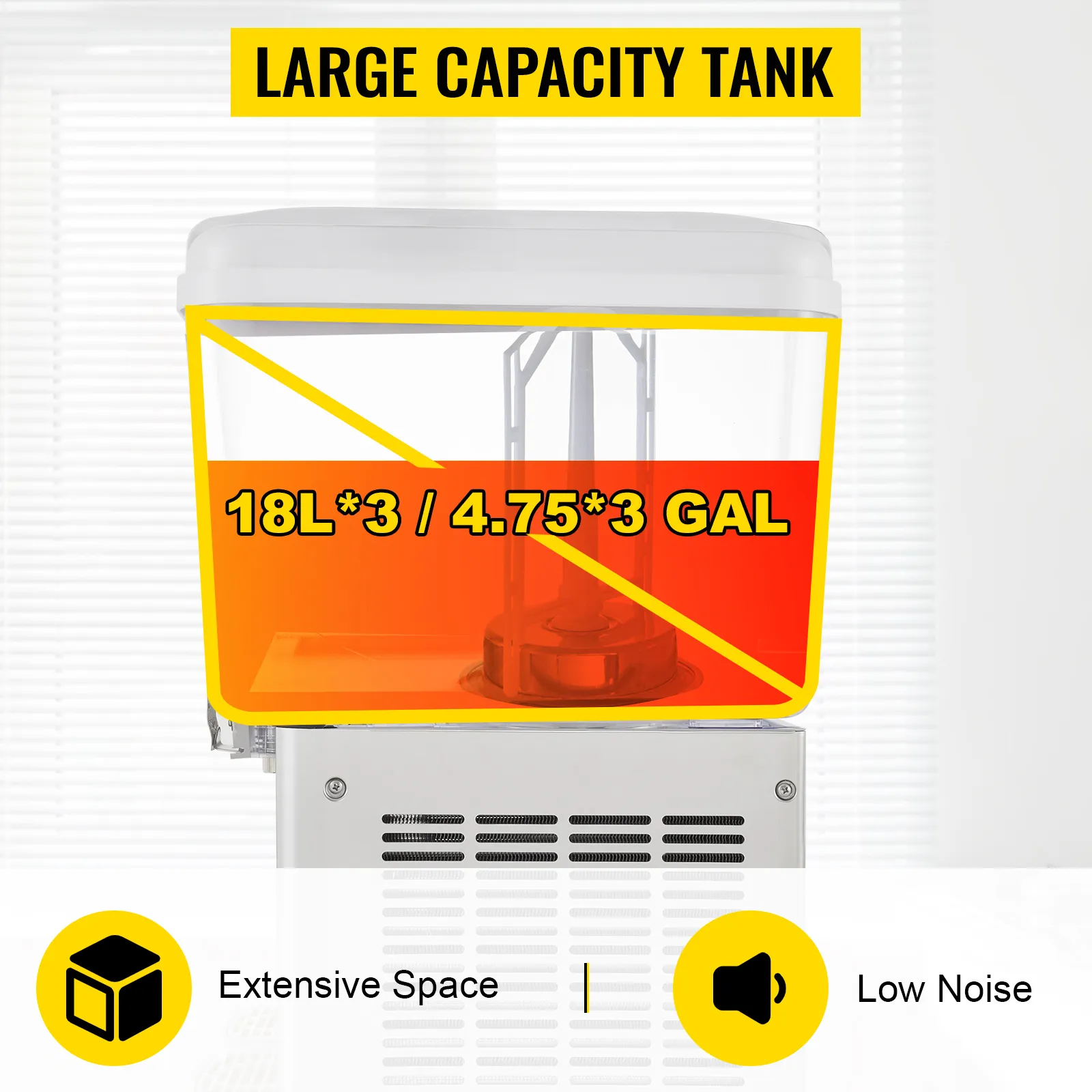 Máquina de bebidas frías de tres tanques de 14,25 galones estadounidenses con descarga grande de configuración razonable, excelente rendimiento, apariencia elegante y operación simple. Grifo agrandado para fibra de fruta y pequeños gránulos con sabor, una forma atractiva de servir a sus invitados su favorito. El tanque de PC sin BPA, el cuerpo de la máquina de acero inoxidable de primer nivel y los aparadores barnizados para hornear forman un guardián de la salud resistente al desgaste y fácil de limpiar. Un ayudante imprescindible con capacidad suficiente para las necesidades diarias.