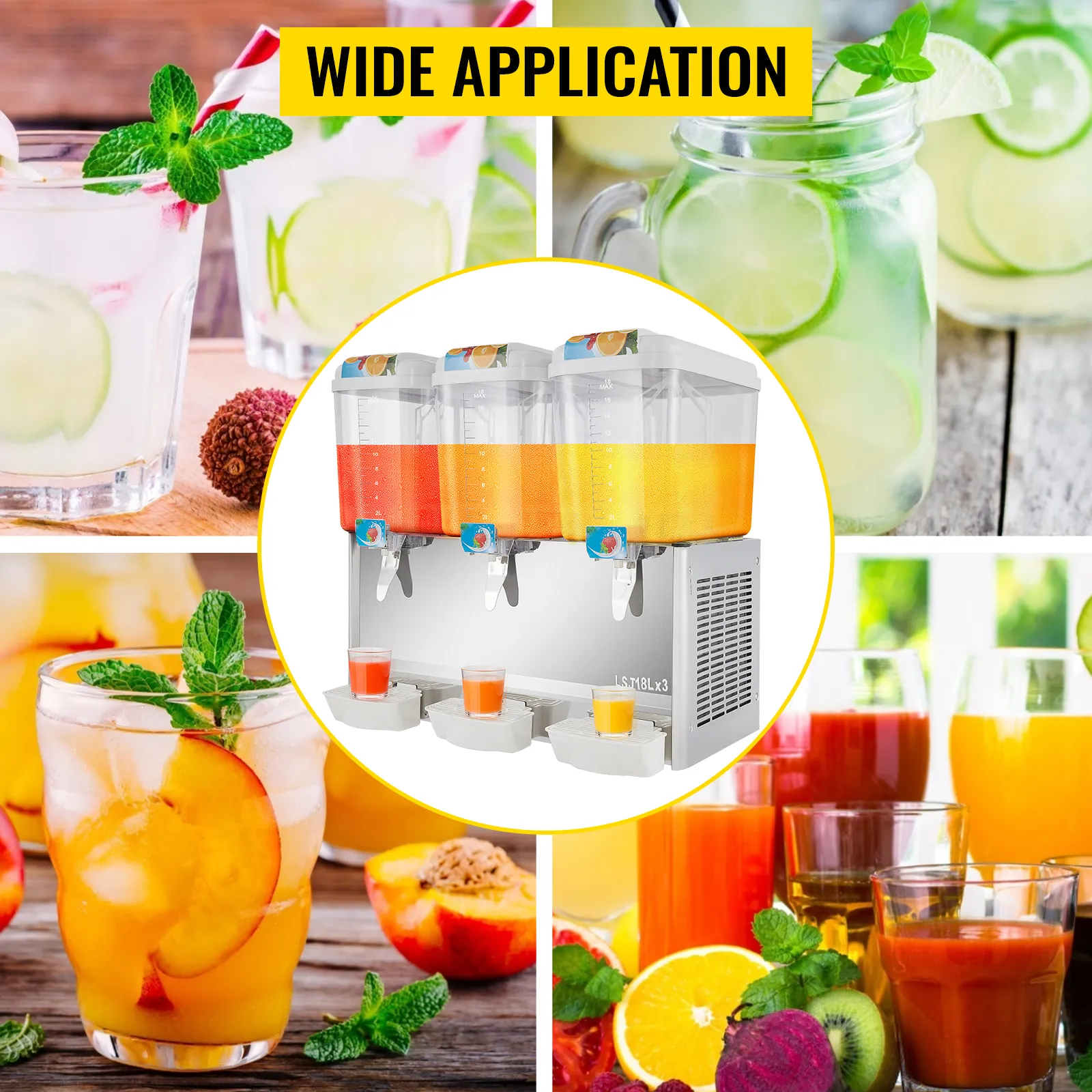 Dispensador de bebidas, con tanques triples, 18 L (4,8 gal EE.UU.) por tanque, compacto y de gran rendimiento. Los agitadores ampliados permiten una agitación de 360° más eficiente. Las juntas de sellado de goma eliminan las fugas de jugo.