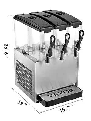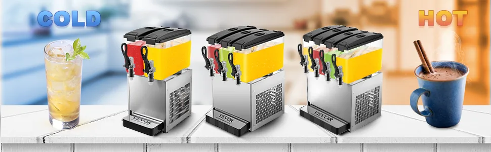 Máquina de bebidas FRÍAS Y CALIENTES de 3 tanques y 9.5 galones estadounidenses con descarga grande de configuración razonable, excelente rendimiento, apariencia elegante y operación simple. Grifo agrandado para fibra de fruta y pequeños gránulos con sabor, una forma atractiva de servir a sus invitados su favorito. El tanque de PC libre de BPA, el cuerpo de la máquina de acero inoxidable de primer nivel y los aparadores barnizados para hornear forman un guardián de la salud resistente al desgaste y fácil de limpiar. Un ayudante imprescindible con capacidad suficiente para las necesidades diarias.