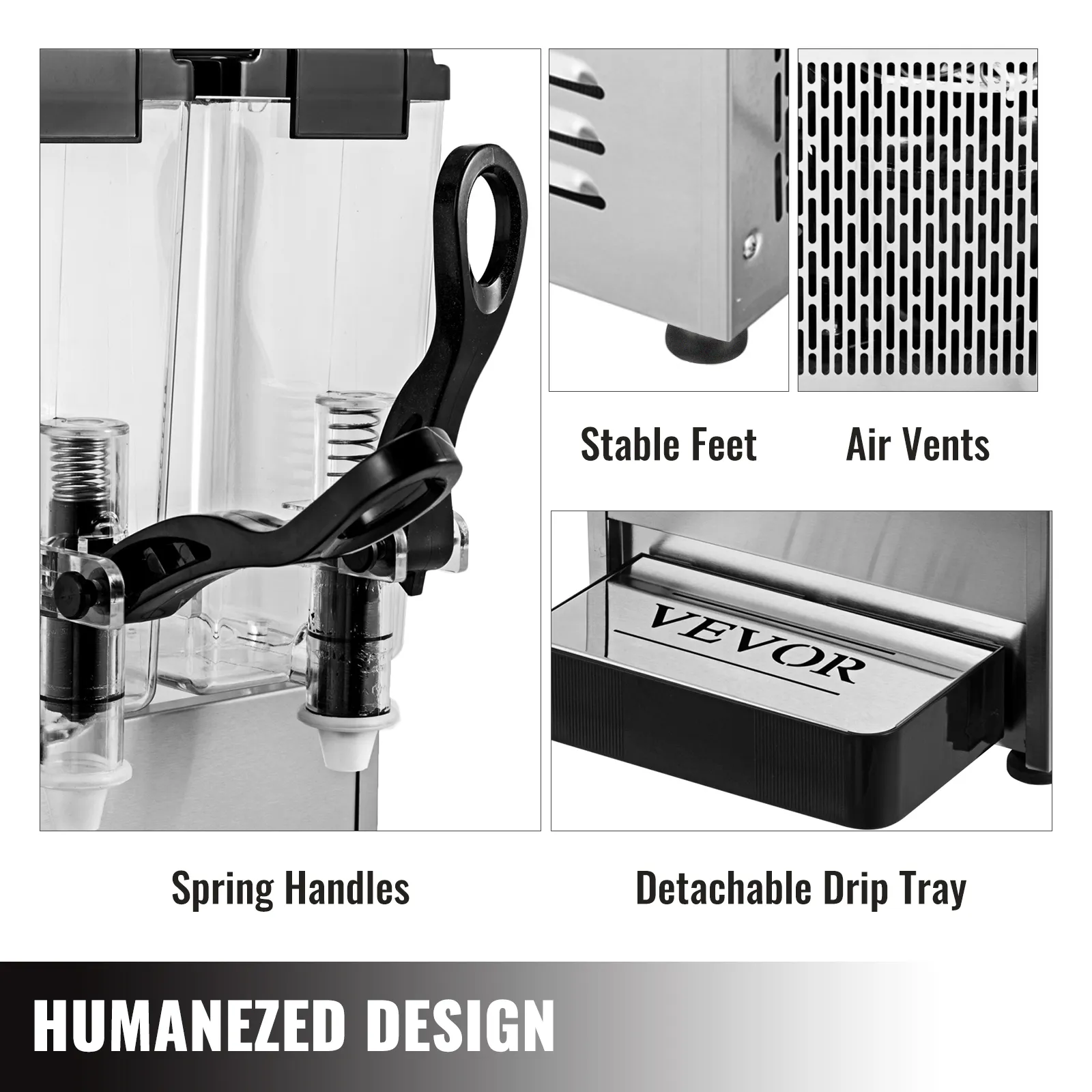 La bandeja de goteo se puede desmontar sin esfuerzo para facilitar la limpieza; Salidas de bebidas de diseño especial con resorte para un uso sin esfuerzo; Múltiples salidas de aire para una rápida disipación del calor; Patas antideslizantes para mayor estabilidad.