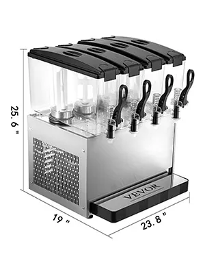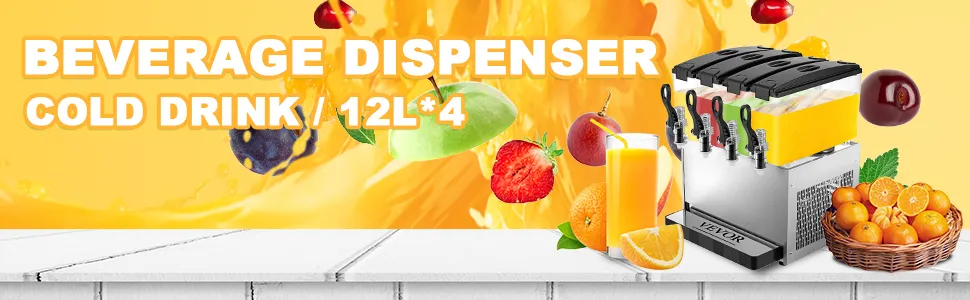 Máquina de bebidas frías de 4 tanques y 12.7 galones estadounidenses con descarga grande de configuración razonable, excelente rendimiento, apariencia elegante y operación simple. Grifo agrandado para fibra de fruta y pequeños gránulos con sabor, una forma atractiva de servir a sus invitados su favorito. El tanque de PC libre de BPA, el cuerpo de la máquina de acero inoxidable de primer nivel y los aparadores barnizados para hornear forman un guardián de la salud resistente al desgaste y fácil de limpiar. Un ayudante imprescindible con capacidad suficiente para las necesidades diarias.