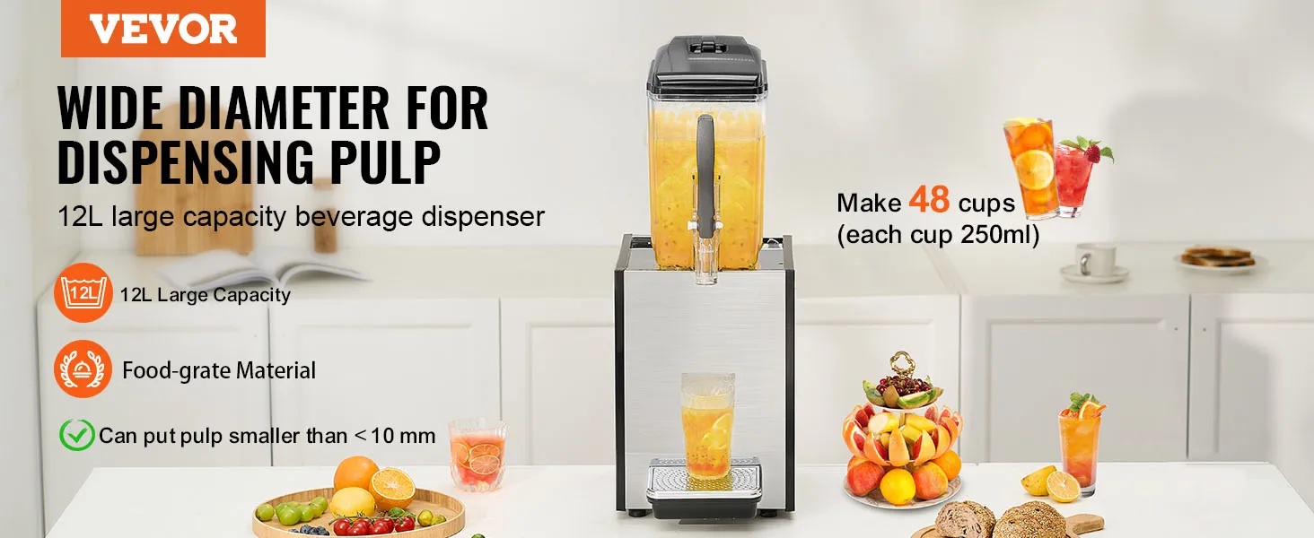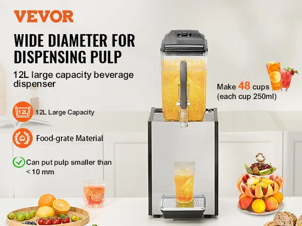 Gran capacidad: este dispensador de bebidas comercial tiene una capacidad de tanque de 12 L, lo que permite acomodar un gran volumen de bebidas. Cuenta con un pico dispensador mejorado de diámetro amplio, que permite dispensar de manera suave y fácil bebidas con partículas pequeñas, como jugo de coco y pulpa de fruta. Equipado con un anillo de sellado de goma para evitar fugas de bebidas.