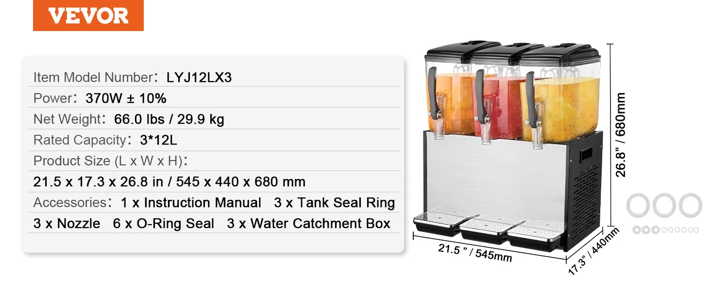 Dispensador de bebidas comercial VEVOR, 3 tanques de 12 L (12,7 cuartos de galón por tanque), dispensador de jugo, máquina de té helado de acero inoxidable de 370 W con temperatura de enfriamiento de 7,2 a 12 °C, para bebidas frías en restaurantes, bares y fiestas.