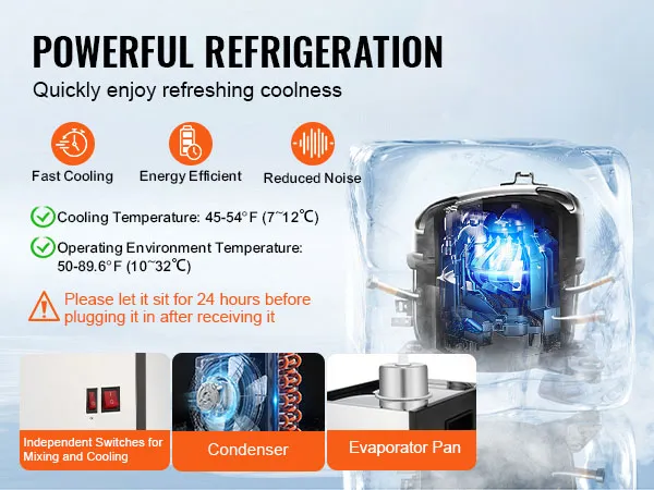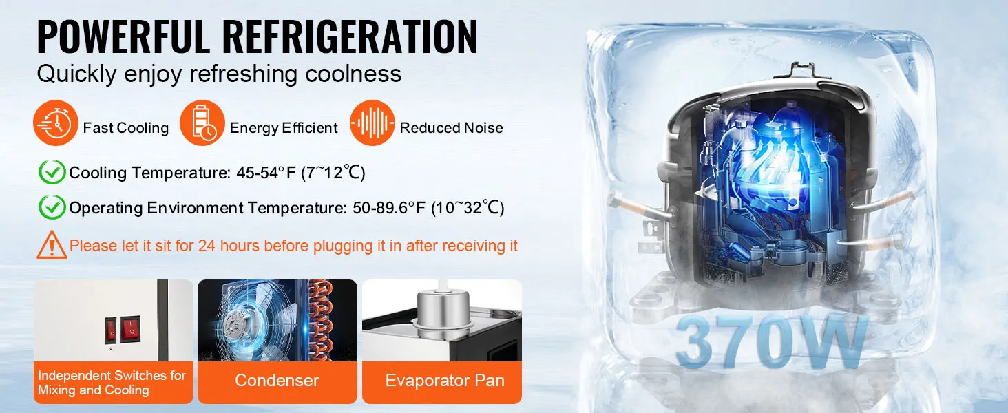 Control de temperatura eficiente: los componentes del compresor y del condensador garantizan un enfriamiento rápido y una alta eficiencia. El evaporador de acero inoxidable 304 apto para uso alimentario de gran superficie acelera el enfriamiento, mientras que la varilla agitadora garantiza una mezcla completa para lograr una temperatura uniforme de la bebida. Mantiene la temperatura de la bebida dentro de un rango cómodo de 45 a 54 °F (7 a 12 °C). Los interruptores de botón simples facilitan la configuración de las funciones de enfriamiento y agitación.