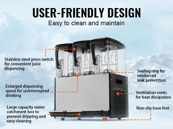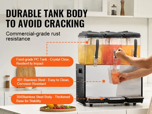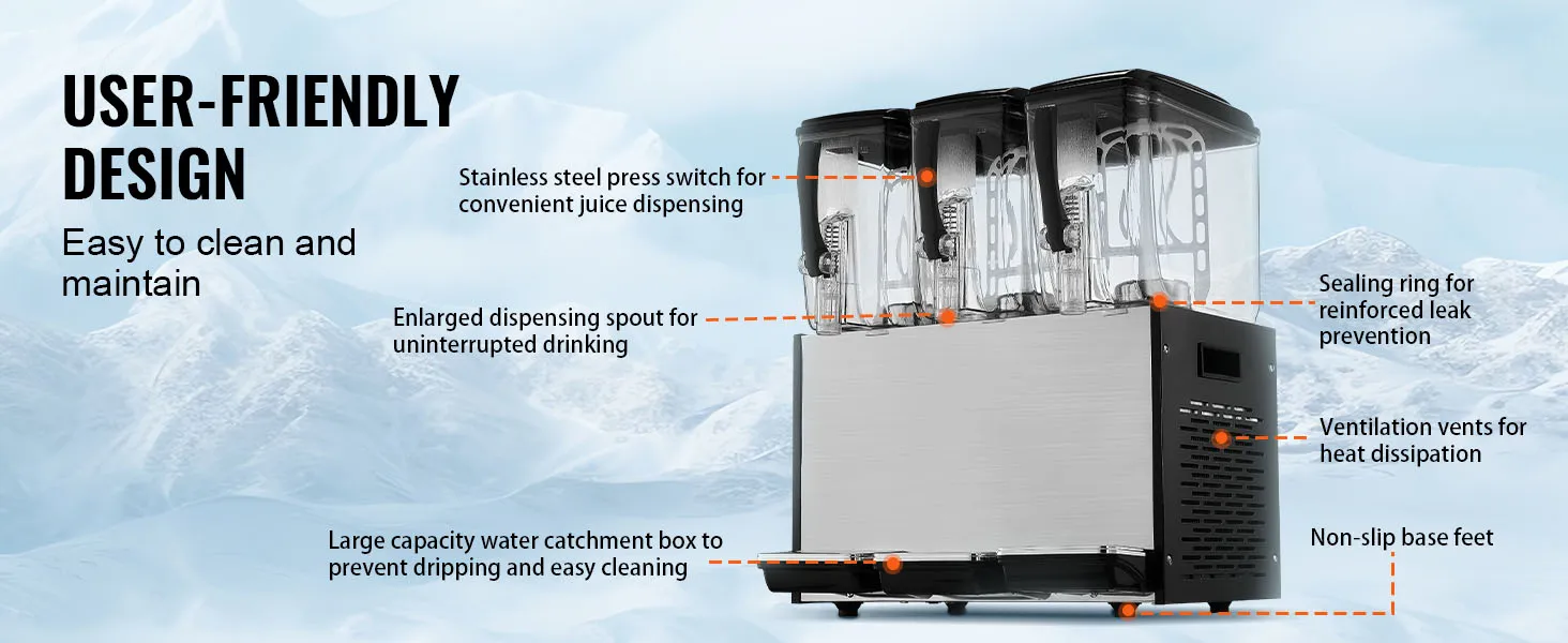Diseño fácil de usar: cuenta con un interruptor de presión de acero inoxidable para dispensar jugo cómodamente y un pico dispensador agrandado para beber sin interrupciones. Se puede operar con una mano. La parte inferior tiene una bandeja de recepción de agua de gran capacidad para evitar que la bebida gotee, lo que elimina la necesidad de verter agua con frecuencia. El radiador mejorado y la base antideslizante garantizan la seguridad.