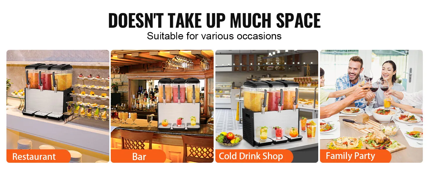 Esta máquina de bebidas se utiliza principalmente para enfriar bebidas. Es adecuada para diversas ocasiones, incluidas reuniones familiares, restaurantes, hoteles, cines, etc., y admite diferentes tipos de bebidas, como café, jugo de frutas, leche de soja, batidos, cócteles, yogur y café.