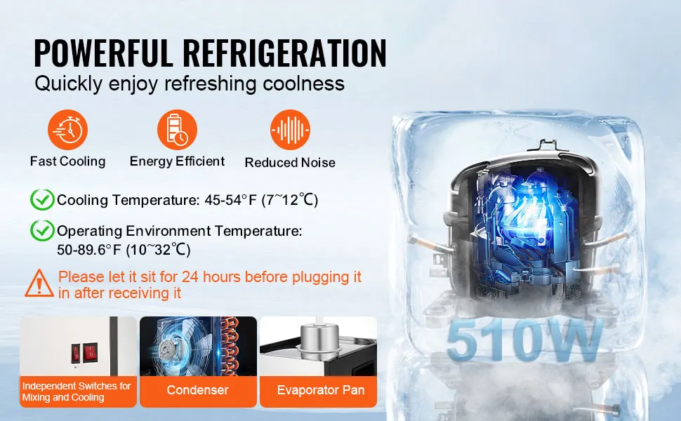 Con un rendimiento estable del compresor y un funcionamiento potente, ahorra tiempo y energía. El evaporador se congela rápidamente, manteniendo la temperatura del jugo entre 45 y 54 °F (7 a 12 °C) durante el enfriamiento. Equipado con interruptores independientes para controlar por separado la mezcla y el enfriamiento.