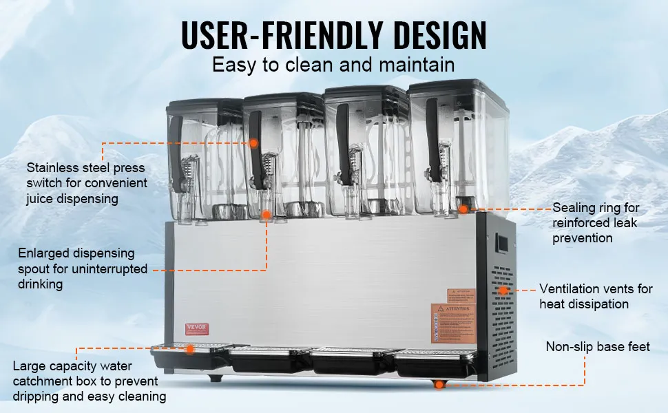 Diseño fácil de usar: cuenta con un interruptor de presión de acero inoxidable para dispensar jugo cómodamente y un pico dispensador agrandado para beber sin interrupciones. Se puede operar con una mano. La parte inferior tiene una bandeja de recepción de agua de gran capacidad para evitar que la bebida gotee, lo que elimina la necesidad de verter agua con frecuencia. El radiador mejorado y la base antideslizante garantizan la seguridad.