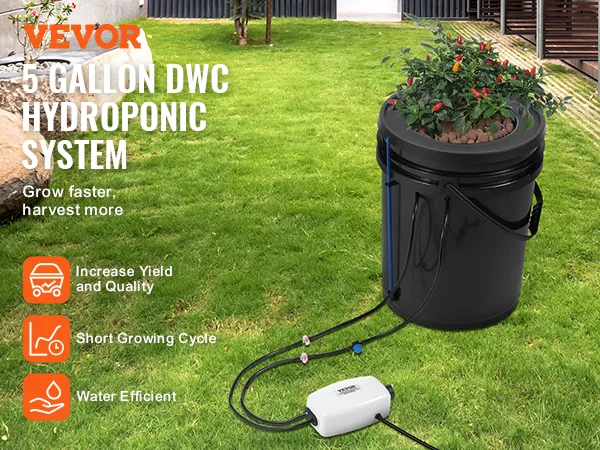El kit hidropónico DWC tiene un balde con capacidad de 5 galones y una canasta de plantación con abertura de 8", lo que le permite cultivar una variedad de verduras y frutas. El riego por goteo superior preciso con buen sellado mejora la absorción de agua.