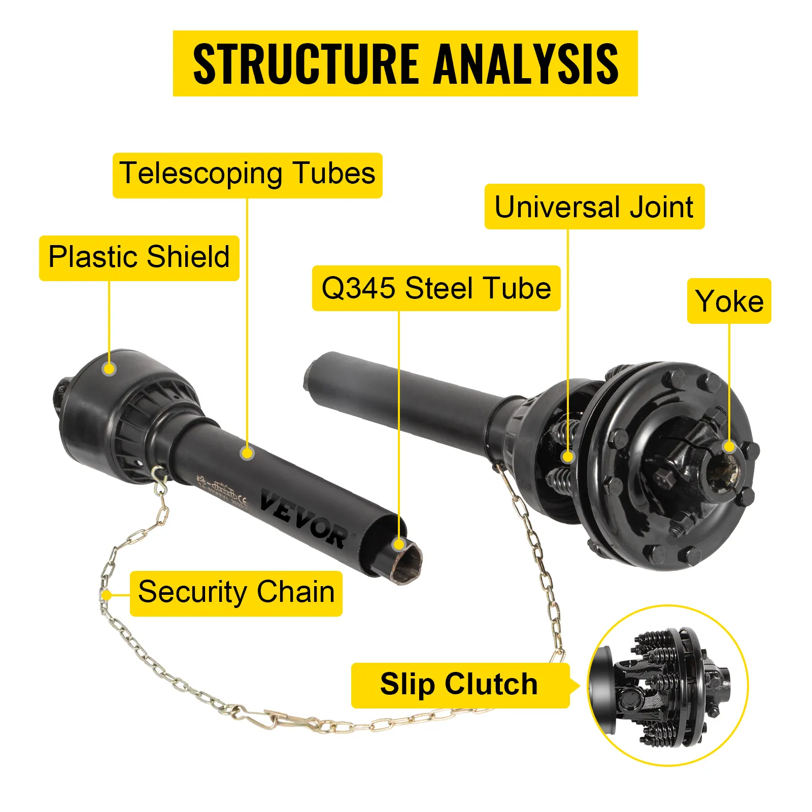 El eje de la TDF está ensamblado en una estructura compacta que consta de un embrague deslizante, un tubo telescópico, una junta universal, yugos, un protector de plástico y una cadena de protección. Permite dos velocidades en ambos extremos y transfiere la potencia al equipo.