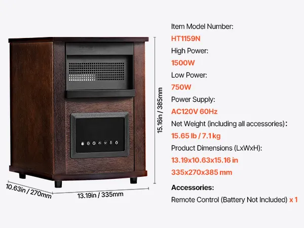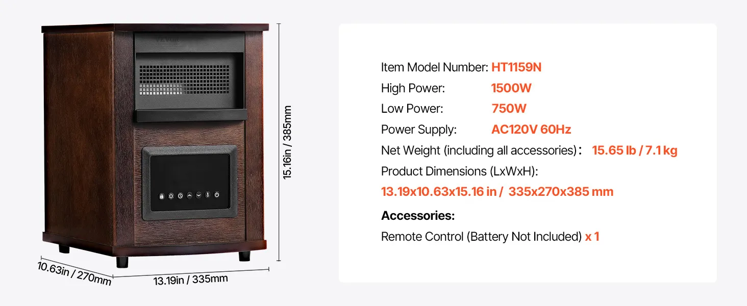 Calefactor infrarrojo VEVOR de 1500 W con control remoto, pantalla LED y temporizador de 24 horas. Temperatura ajustable para patio, dormitorio, sala de estar, estudio y comedor.